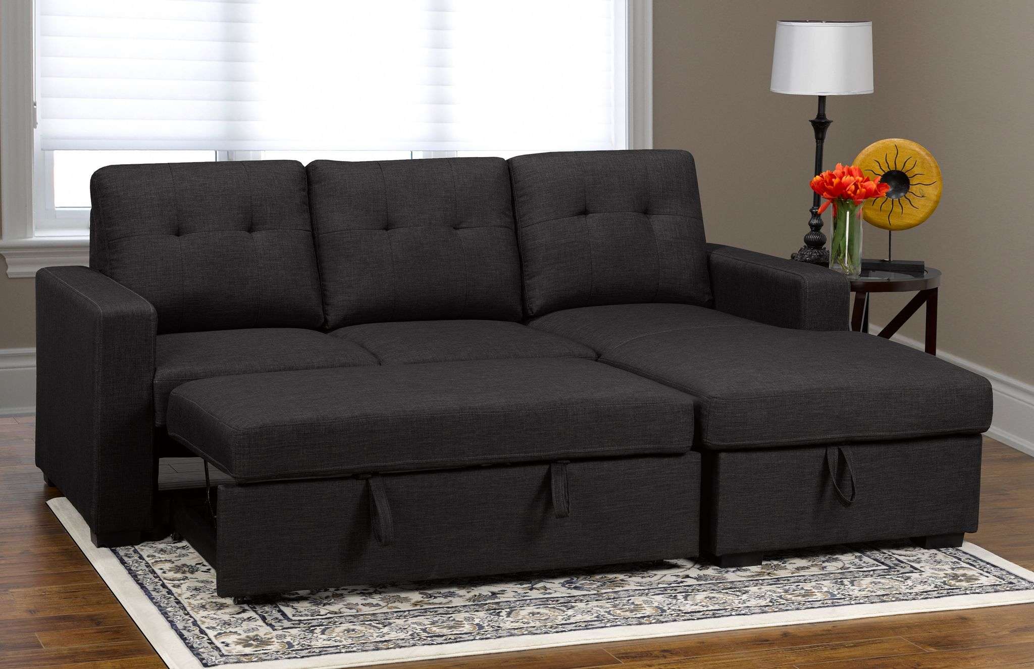 Crafted from high-quality fabric in a sleek charcoal grey color, the Boris sectional exudes modern sophistication while offering superior comfort. Its pull-out sofa bed provides a convenient sleeping solution for guests, while the lift top storage in the chaise offers ample space to store blankets, pillows, and other essentials. Supported by a solid wood frame, the Boris sectional sofa bed is both durable and stylish, making it the perfect centerpiece for any modern home.