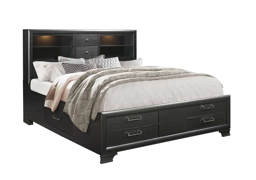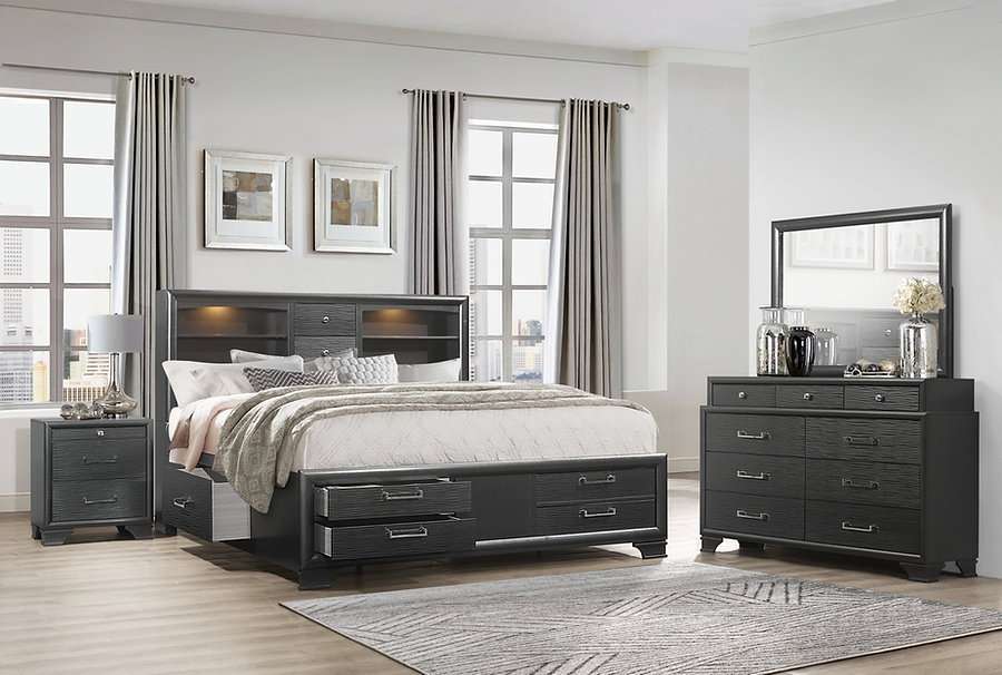 Introducing our latest addition: Ava, a solid wood platform bed with a sleek grey lacquer finish. Crafted for modern functionality, this bed boasts a storage headboard with integrated lights, perfect for bedtime reading. The carved drawer fronts feature a stylish grey lacquer finish, accentuated by nickel hardware, offering ample storage space for your essentials. Designed with convenience in mind, this platform bed eliminates the need for a box spring, providing sturdy support for your mattress.