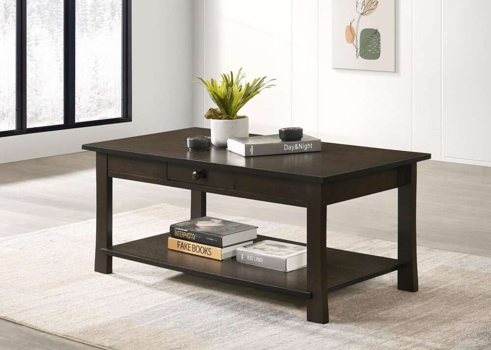 Enhance your living room with this elegant coffee table, crafted from exotic wood. The table features a rich espresso finish, adding a touch of sophistication to any space. Measuring 42'L x 22'W x 18'H, it provides ample surface area for decor and everyday items. A convenient pull-out storage drawer offers a discreet space for stashing remotes, magazines, or other essentials, while the lower storage shelf provides additional room for books and decorative pieces. This coffee table seamlessly combines functionality and style, making it a perfect centerpiece for your living area.