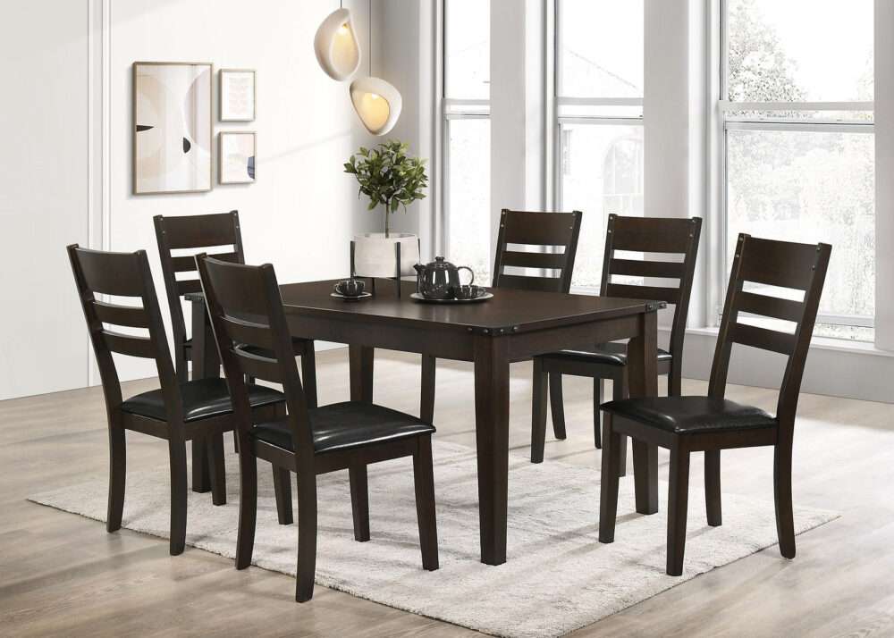 Enhance your dining room with this stunning dining set, embodying a perfect blend of rustic charm and elegant design. The set features a table and six ladder back chairs, all crafted from exotic wood for exceptional durability and a luxurious feel. The rich espresso finish adds warmth and depth, making it a versatile addition to any dining space.