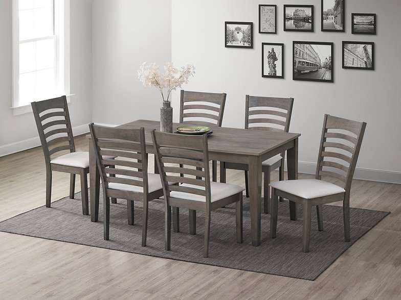 Elevate your dining space with this sophisticated dining set, combining modern aesthetics with timeless design elements. The set includes a table and six ladder back chairs, all crafted from high-quality rubber wood, ensuring durability and elegance. The antique grey finish adds a contemporary touch, making this set a perfect fit for any modern dining room.