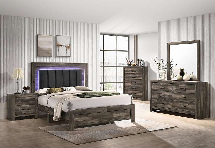 Transform your bedroom into a stylish retreat with this Modern Farmhouse shiplap-style bedroom set. The set features a driftwood brown finish, adding a rustic yet contemporary touch to your space. The headboard is upholstered in luxurious black velvet and includes integrated lights with touch dimmable controls, offering three levels of brightness to create the perfect ambiance.