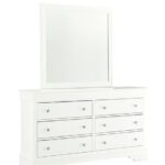 Enhance your bedroom with this stunning dresser mirror, crafted from tropical wood, including MDF and veneers, for lasting durability. The dresser features front French dovetail drawers and back nail center metal glides, ensuring smooth and reliable operation. Crystal hardware adds a touch of elegance, while the crocodile veneer fronts provide a unique and luxurious texture. Finished in a sleek metallic white, this dresser mirror seamlessly blends modern style with practical functionality. It’s a perfect addition to any bedroom, offering both aesthetic appeal and durable construction for long-term use.