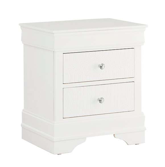Enhance your bedroom with this stunning nightstand, crafted from tropical wood, including MDF and veneers, for lasting durability. The nightstand features front French dovetail drawers and back nail center metal glides, ensuring smooth and reliable operation. Crystal hardware adds a touch of elegance, while the crocodile veneer fronts provide a unique and luxurious texture. Finished in a sleek metallic white, this nightstand seamlessly blends modern style with practical functionality. It’s a perfect addition to any bedroom, offering both aesthetic appeal and durable construction for long-term use.