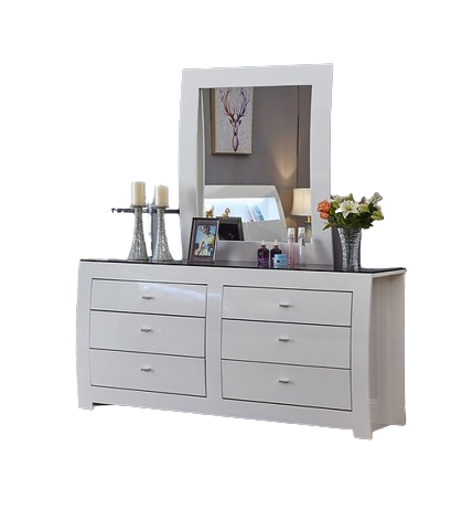 Enhance your bedroom with this elegant dresser mirror featuring a sleek white high gloss finish. The modern design is complemented by black glass tops on the case goods, adding a sophisticated contrast that elevates the overall aesthetic. This dresser mirror not only provides functionality but also enhances the decor of your room with its contemporary style. Perfect for a chic and polished look, it combines practical use with a refined design, making it a stylish addition to any bedroom. Enjoy the seamless blend of elegance and modernity with this beautifully crafted dresser mirror.
