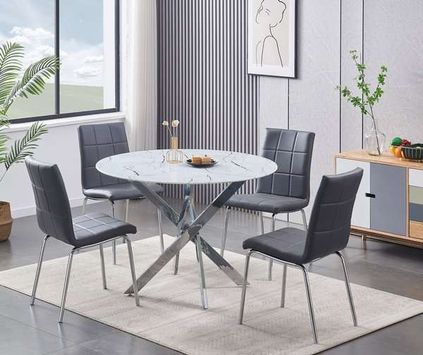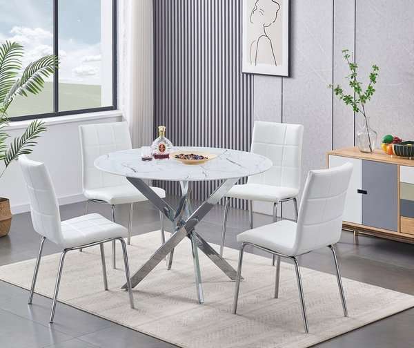 Upgrade your dining area with this elegant 5-piece dining set, a perfect blend of modern sophistication and practical design. The centerpiece of the set is a stunning table featuring a 10mm tempered white marble glass top, providing a sleek and durable surface that’s both easy to clean and visually striking. The chrome legs add a touch of contemporary elegance, offering sturdy support and a reflective finish that enhances the table’s marble pattern.