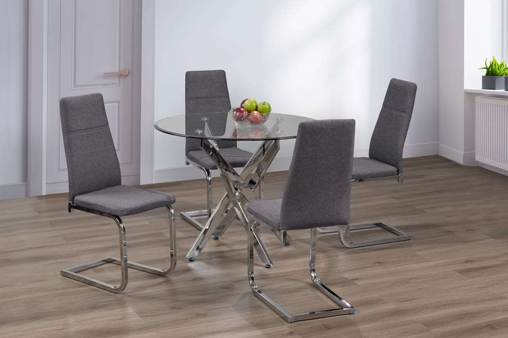 Adding to the table’s charm are the unique cross-hatch chrome legs, which are as functional as they are stylish. These legs provide sturdy support while serving as a striking focal point, ensuring that this dining set becomes a conversation starter during every meal.
