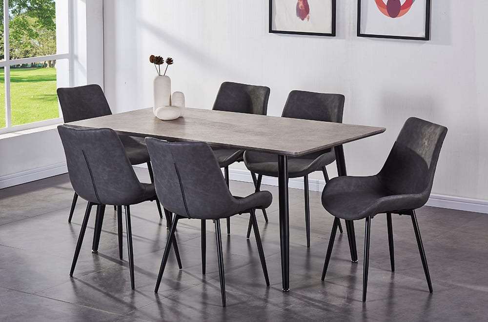 Elevate your dining experience with our modern concrete look dining set, a perfect fusion of style, comfort, and durability. This set is designed to be the centerpiece of your dining area, bringing modern sophistication and timeless elegance into your home. The concrete look table top offers a sleek, urban-inspired design that adds versatility and sophistication to any interior style. Its modern aesthetic makes a bold statement while remaining functional for everyday use. Supported by sturdy metal legs, the table ensures long-lasting stability and a touch of elegance to your dining space.