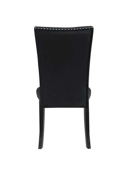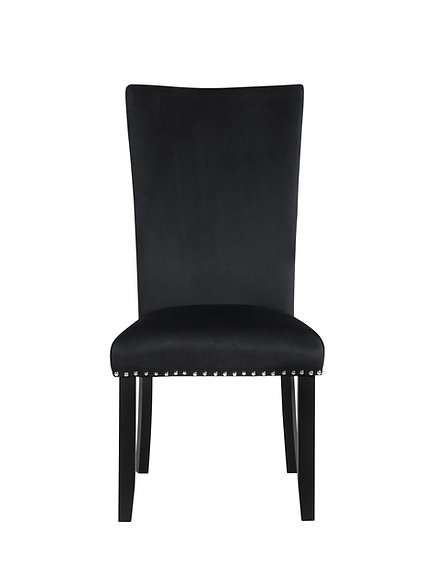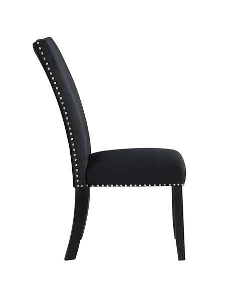 These dining chairs offer a luxurious blend of comfort and style with their soft, overstuffed black velvet upholstery. The plush cushions provide a cozy seating experience, making them perfect for long meals or gatherings. Accentuated by elegant nailhead trim, these chairs exude sophistication and add a touch of glamour to any dining room. The sturdy construction ensures durability, while the rich black velvet finish complements a variety of décor styles, from contemporary to classic. Whether for everyday use or special occasions, these chairs are designed to enhance both comfort and aesthetic appeal in your dining space.