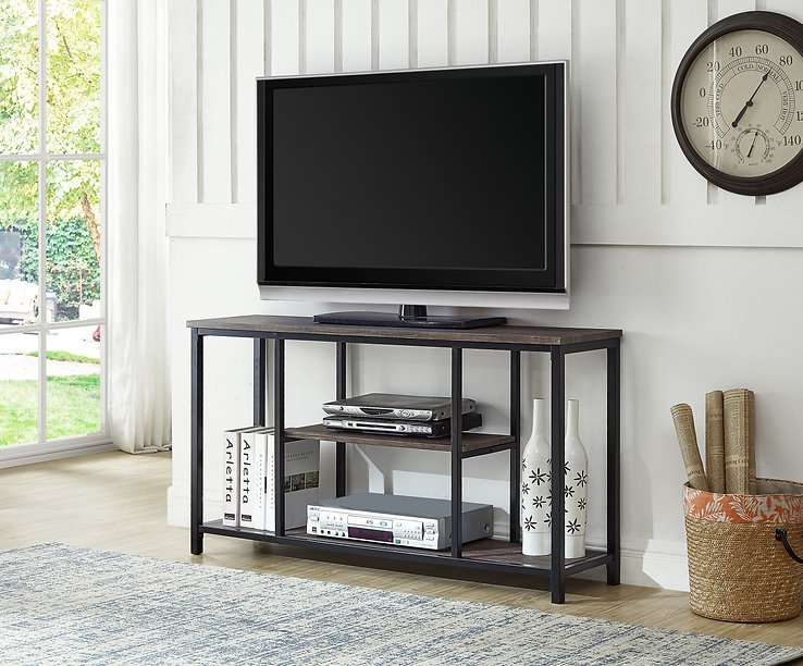 Bring a sleek, industrial touch to your living space with this modern TV stand. Featuring a sturdy metal frame, it ensures stability and durability for years of use, while the grey color blends seamlessly with a variety of decor styles. The wood top provides a refined, rustic look that beautifully complements the metal frame, adding a warm touch to the design.