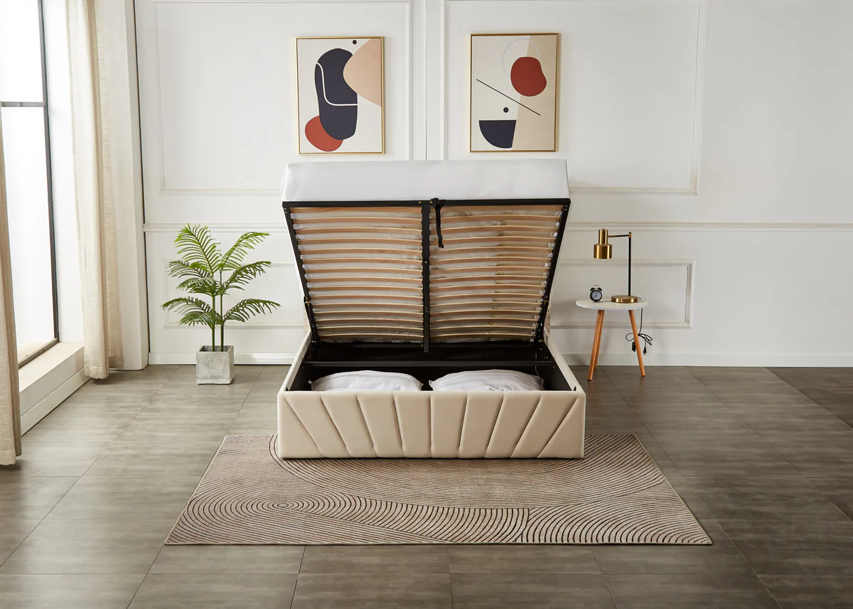 Beyond its striking design, this bed frame is built for practicality. The hydraulic lift storage mechanism provides a hidden, spacious compartment for storing linens, pillows, or other essentials, keeping your room organized and clutter-free. A solid wood frame ensures durability and stability, while the platform base eliminates the need for a box spring. Experience the perfect blend of modern aesthetics and functional design with this elegant beige velvet bed frame.