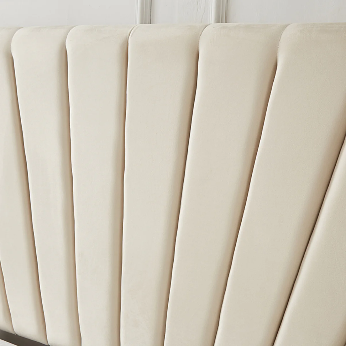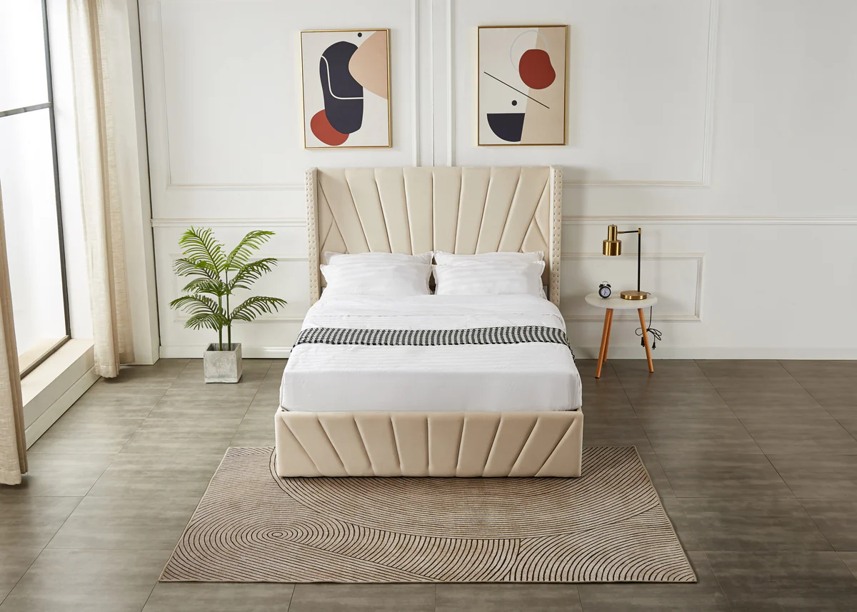 Upgrade your bedroom with our luxurious beige velvet bed frame, designed to combine modern style, practicality, and unmatched elegance. The standout panel design, with vertical lines running across the headboard and footboard, creates a sleek and contemporary look. The added wing accents on both sides of the headboard bring a touch of sophistication, framing your sleeping space with timeless charm. Upholstered in soft beige velvet fabric, this bed offers a refined texture and a neutral hue that complements a variety of interior styles.