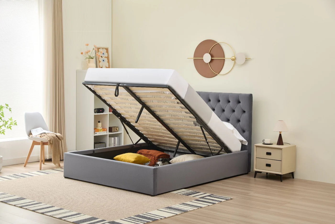 This bed goes beyond aesthetics with its hydraulic lift top storage, providing a convenient solution for linens, pillows, or other essentials. The space-saving design maximizes your bedroom’s layout, keeping everything neatly concealed yet easily accessible. The platform base eliminates the need for a box spring, maintaining a sleek, low-profile look while ensuring ample support. Built with a solid wood frame, it delivers durability and stability for a restful night’s sleep, providing reliable support. Experience a balance of style and function in your routine.
