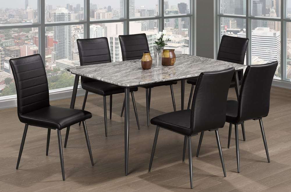 Tapered metal legs in a dark charcoal finish give the table a modern edge while ensuring stability and durability. The accompanying leatherette chairs feature a straight back design, blending comfort with sophistication, and are durable enough for regular use. With six chairs per set, this dining set provides ample seating for family and guests. The hassle-free assembly ensures you’ll enjoy a stylish, functional dining space in no time.