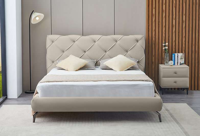 Enhance your bedroom with this modern PU leather bed frame, designed for both style and comfort. Upholstered in a soft crème-colored PU leather, this bed exudes sophistication while offering easy maintenance and durability. The diamond pattern stitching details across the headboard and frame add a touch of elegance, making it a stylish focal point in any contemporary space. High-density foam padding provides exceptional comfort and support, ensuring a plush and inviting look.