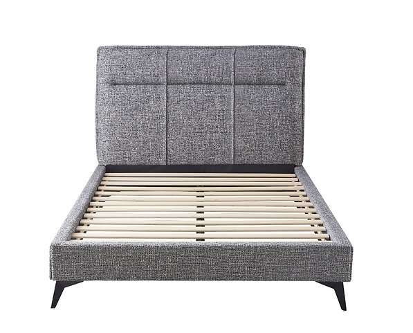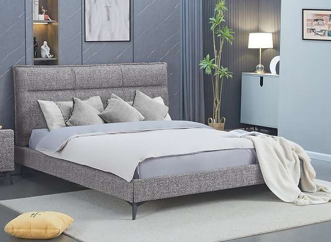 Elevate your bedroom with this modern bed frame, designed for both style and functionality. Upholstered in soft grey fabric, it exudes sophistication while ensuring a cozy, inviting atmosphere. The headboard features subtle stitching details, adding a refined touch that complements contemporary interiors. The sleek, black steel legs provide a striking contrast, enhancing the bed’s modern appeal while offering sturdy support. Crafted with a solid wood frame, this bed ensures long-lasting durability, making it a reliable centerpiece in your space.