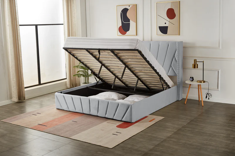 Beyond its striking design, this bed frame is built for practicality. The hydraulic lift storage mechanism provides a hidden, spacious compartment for storing linens, pillows, or other essentials, keeping your room organized and clutter-free. A solid wood frame ensures durability and stability, while the platform base eliminates the need for a box spring. Experience the perfect blend of modern aesthetics and functional design with this elegant grey velvet bed frame.