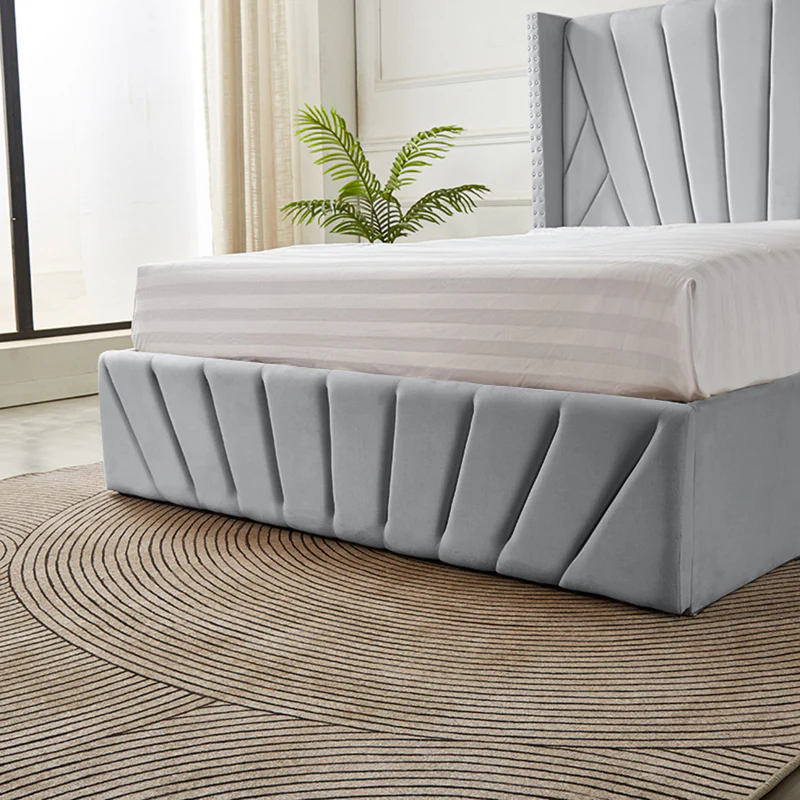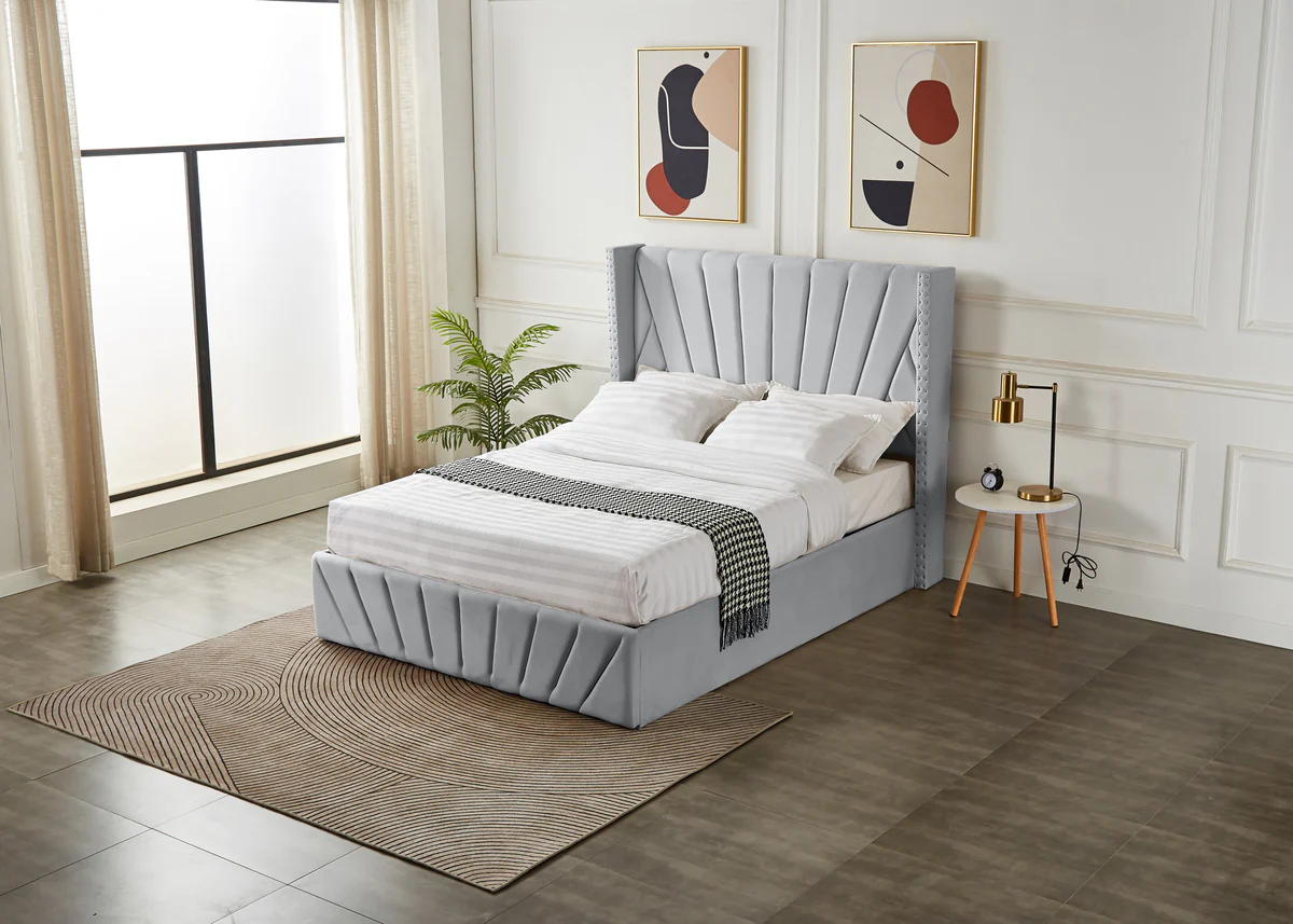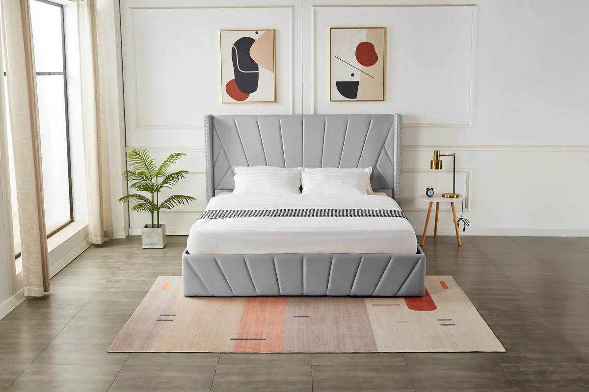 Upgrade your bedroom with our luxurious grey velvet bed frame, designed to combine modern style, practicality, and unmatched elegance. The standout panel design, with vertical lines running across the headboard and footboard, creates a sleek and contemporary look. The added wing accents on both sides of the headboard bring a touch of sophistication, framing your sleeping space with timeless charm. Upholstered in soft grey velvet fabric, this bed offers a refined texture and a neutral hue that complements a variety of interior styles.