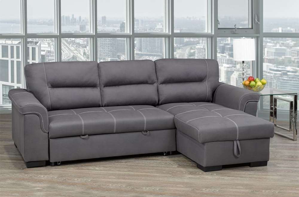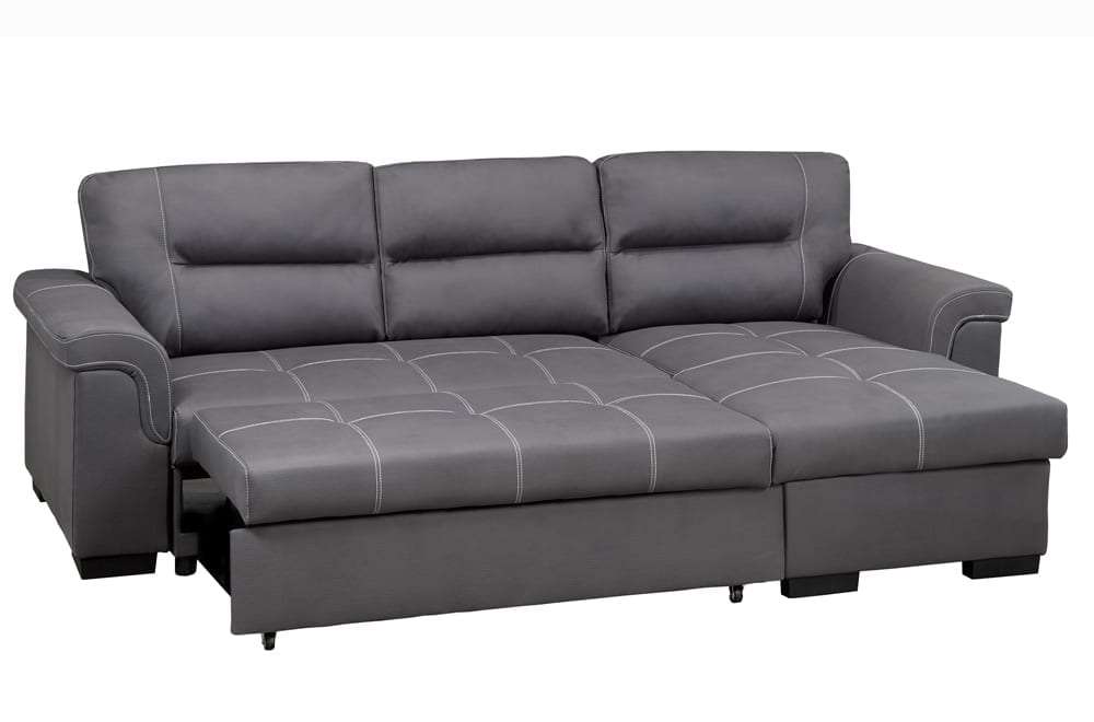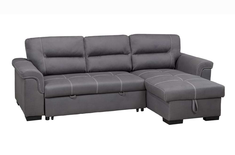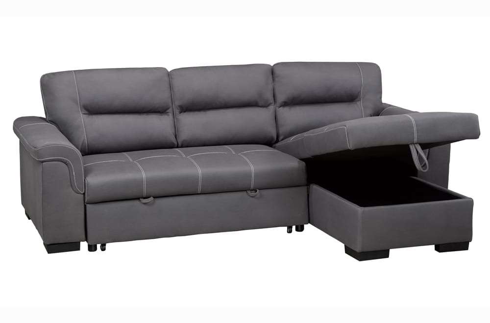 Crafted from luxurious air suede fabric in a calming grey hue, this sofa bed exudes contemporary charm while ensuring durability and easy maintenance. Perfect for hosting guests overnight, the pull-out sofa bed provides a comfortable sleeping space, while the lift-top storage in the chaise offers ample room to stow away blankets, pillows, and other essentials, keeping your living area clutter-free. With a sturdy solid wood frame providing reliable support, the T-1217 sectional sofa bed is both stylish and practical, making it a must-have addition to your home.