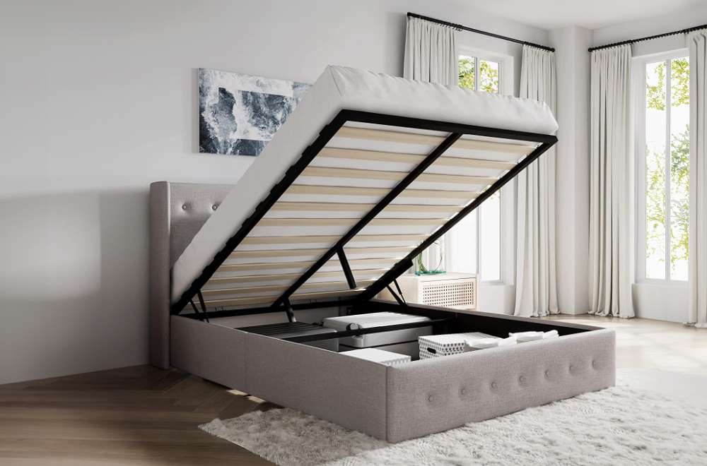 What sets the T-2162 apart is its innovative hydraulic lift storage feature. The platform base effortlessly lifts up, revealing a spacious storage compartment inside, offering a discreet and convenient solution for keeping your bedroom organized. The tufted headboard, adorned with horizontal lines and complemented by protruding wings on the sides, adds a touch of opulence. Crafted with a solid wood frame, the T-2162 ensures durability and longevity, making it a reliable centerpiece for your bedroom. Elevate your sleep sanctuary with the T-2162 Storage Bed, where plush linen, contemporary design, and intelligent storage solutions converge for an exceptional blend of style and functionality.