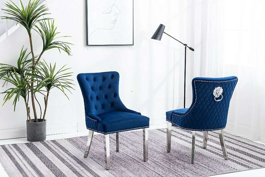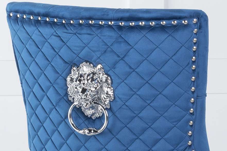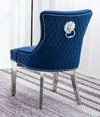 This luxurious dining chair is designed to impress with its blend of opulence and modern elegance. Featuring a chrome lion knocker on the back, it adds a touch of regal flair to your dining space. The polished chrome frame ensures durability and a sleek appearance. The diamond pattern quilted back and button-tufted front offer both comfort and style. Nailhead details along the edges enhance its sophisticated look. Measuring 25'L x 23'W x 38'H and upholstered in plush velvet, this chair is the perfect addition to elevate any dining room with its unique and eye-catching design.