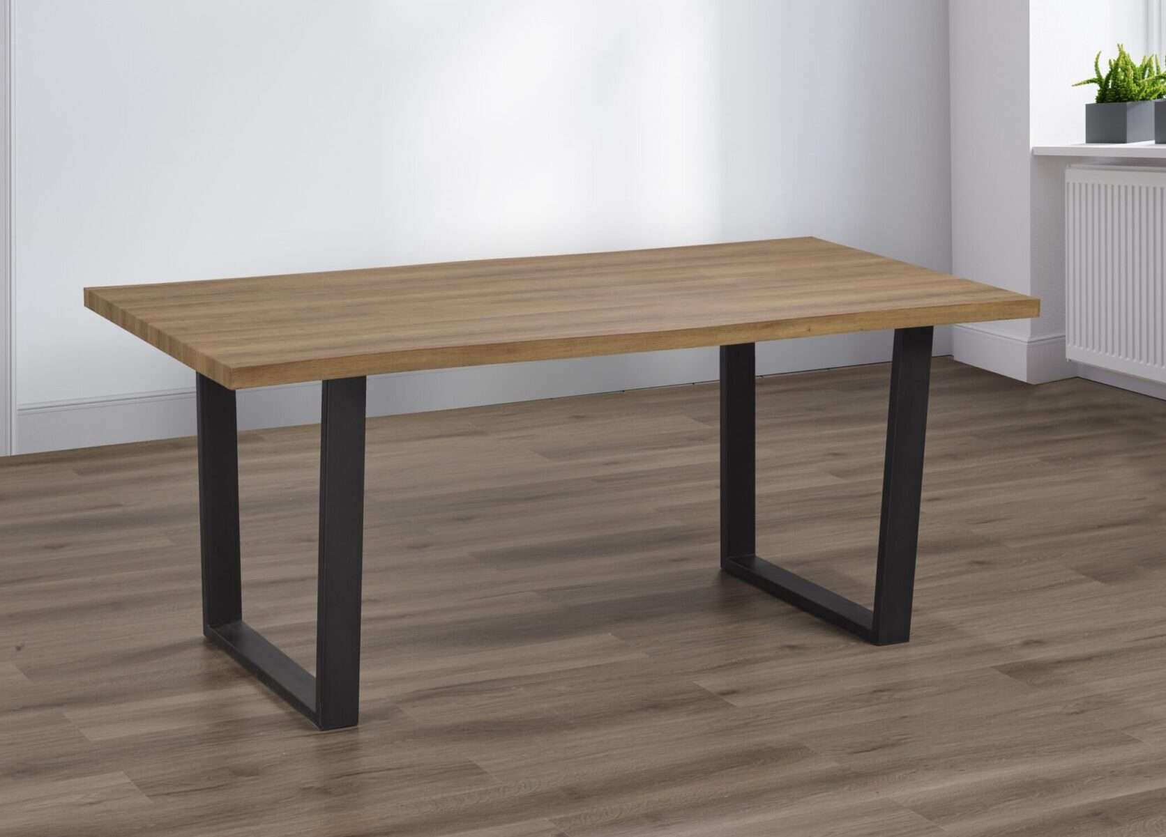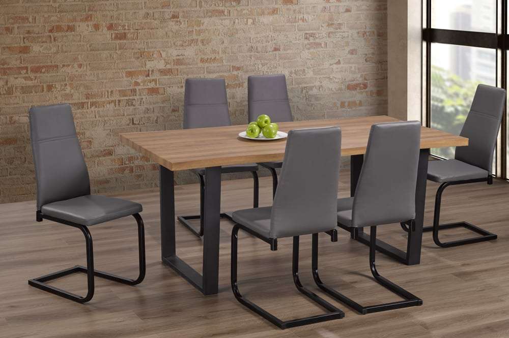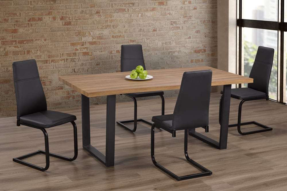 The distressed oak veneer contrasts beautifully with the thick black metal legs, creating a sophisticated blend of rustic and modern elements. This eye-catching combination not only adds visual appeal but also ensures the table is sturdy and durable, built to last through years of family meals and dinner parties. Paired with the table are contoured back PU leather dining chairs, designed for both comfort and style. The sleek metal frames of the chairs complement the table’s design, making this set the perfect choice for creating a warm, welcoming space where lasting memories are made.
