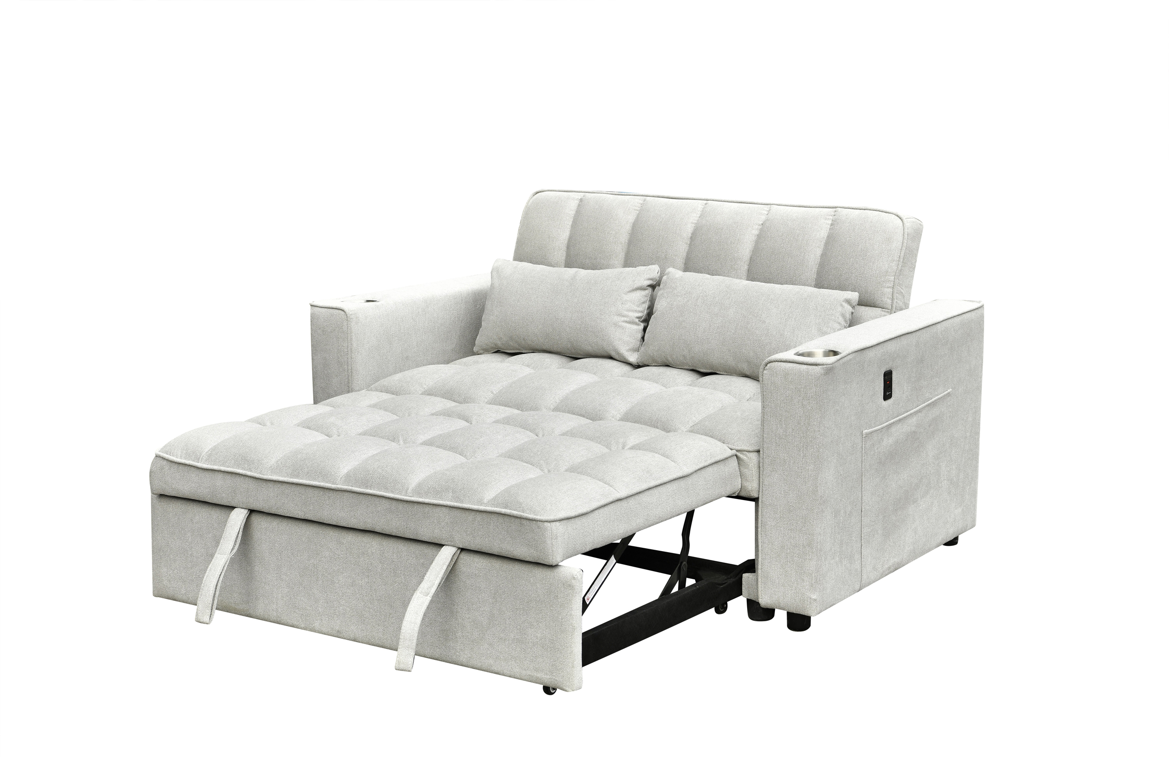 - Opens to a Large Bed - 3 Levels Adjustable Backrest that Folds Flat - Tufted Back and Seat - Accent Pillows - USB Charging Station - 2 Chrome Cup Holders - Side Pocker Storage Compartment - Soft Creme Fabric