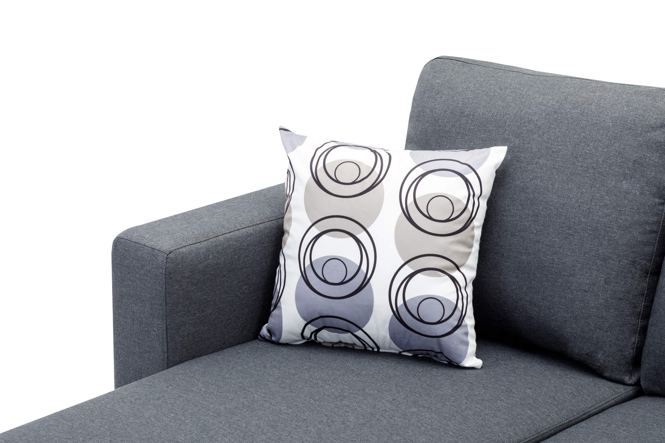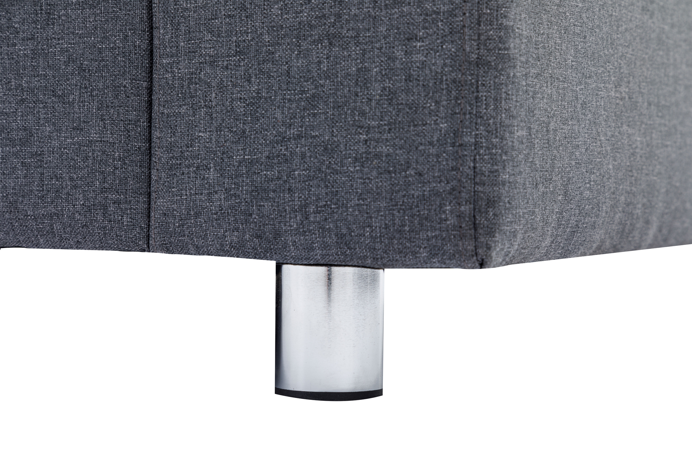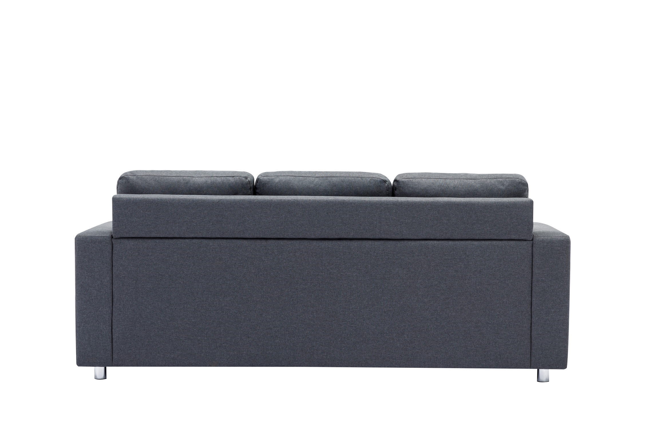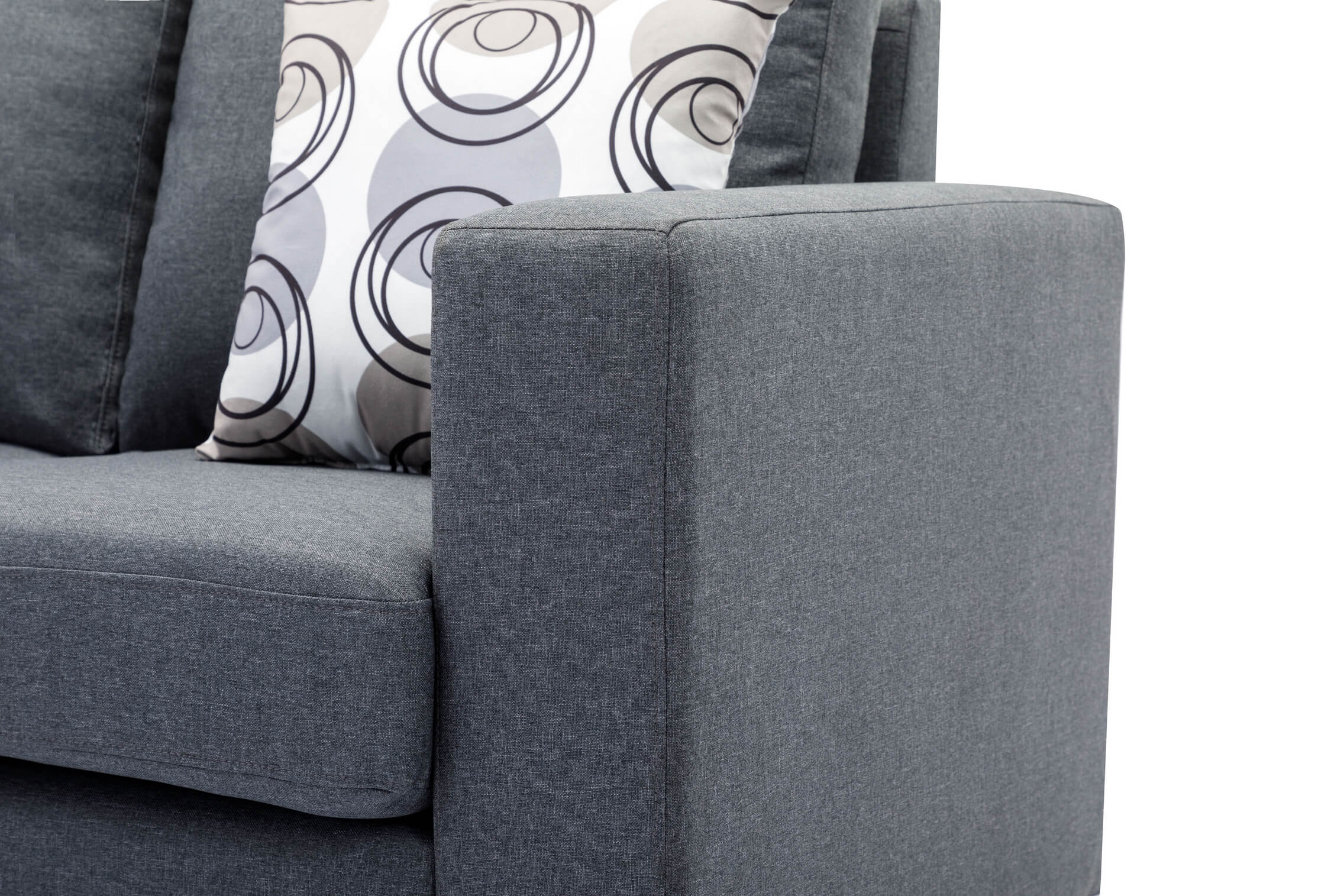 Grey Fabric Sofa With Chrome Legs and Accent Pillows