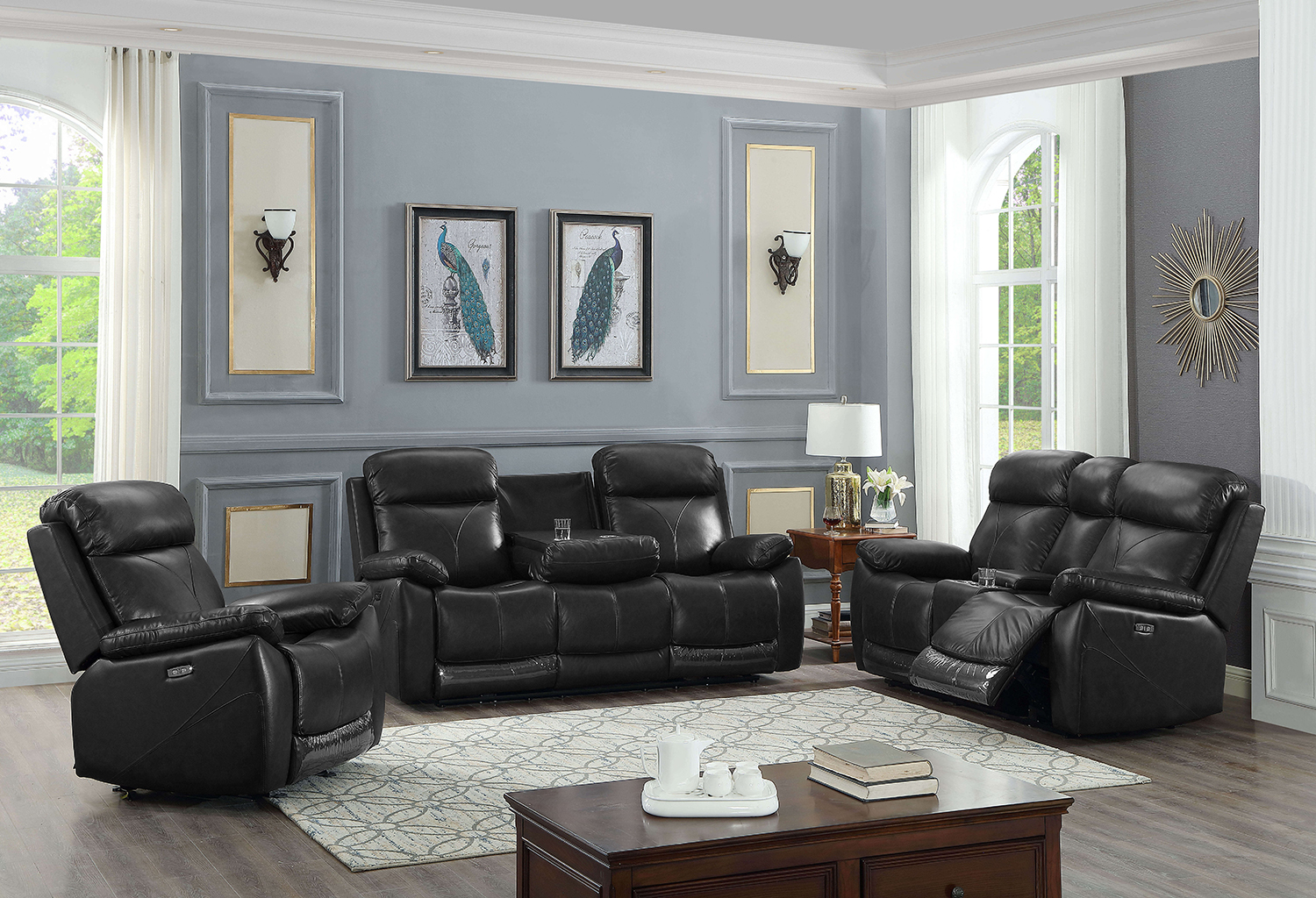 3pc Power Recliner Set Black Genuine Leather/Match **Sofa** 2 Power Recliners, Centre Tray with 2 Cup Holders, 2x USB's **Loveseat** 2 Power Recliners, Centre Storage Console, 2x USB's **Chair** 1 Power Recliner, 2x USB's *NOW WITH ROCKER*