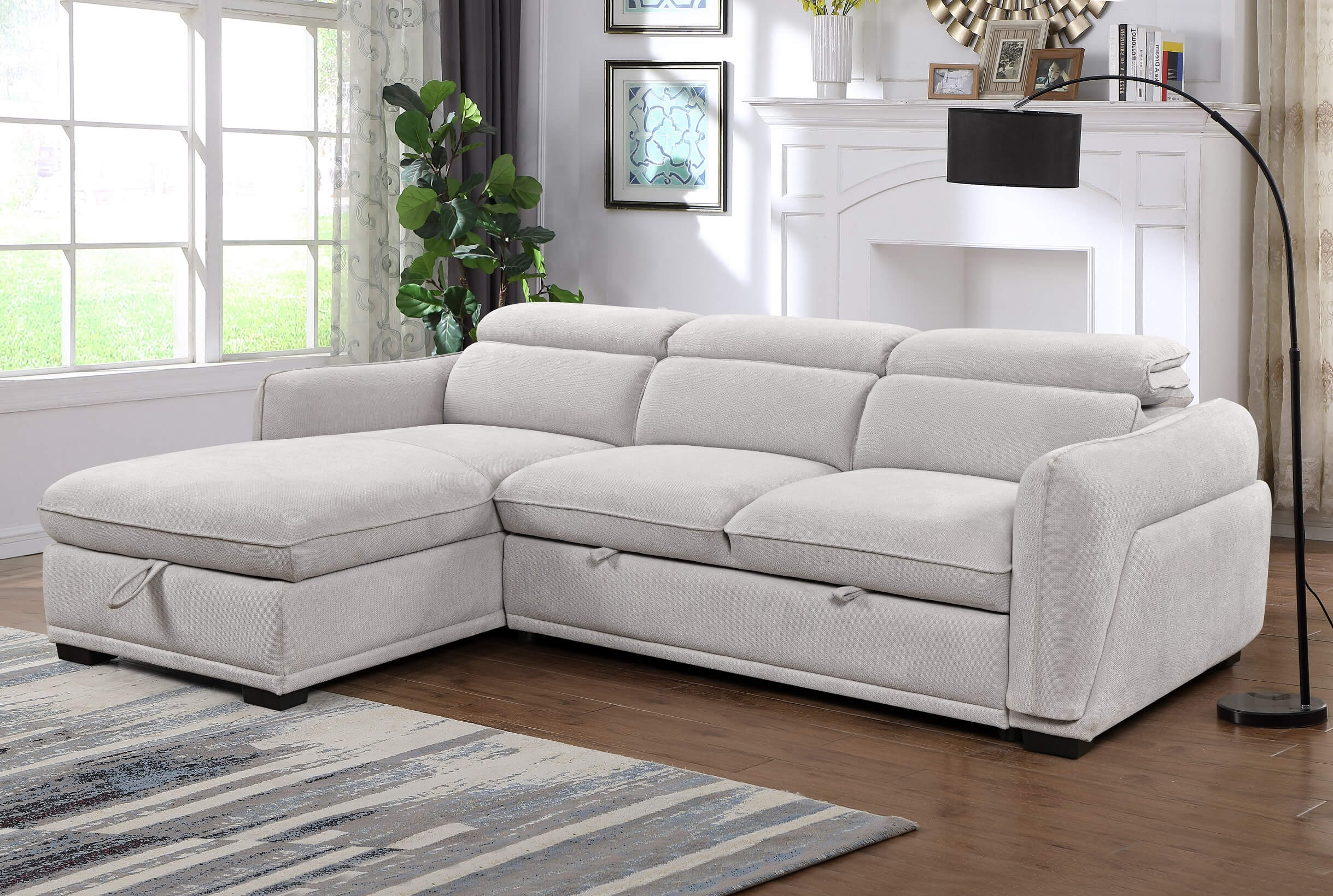 - Left Hand Facing Chaise - Opens to a Bed - Adjustable Headrests - Tufted Back and Seat - Large Lift Up Storage Compartment - Soft Light Grey Fabric