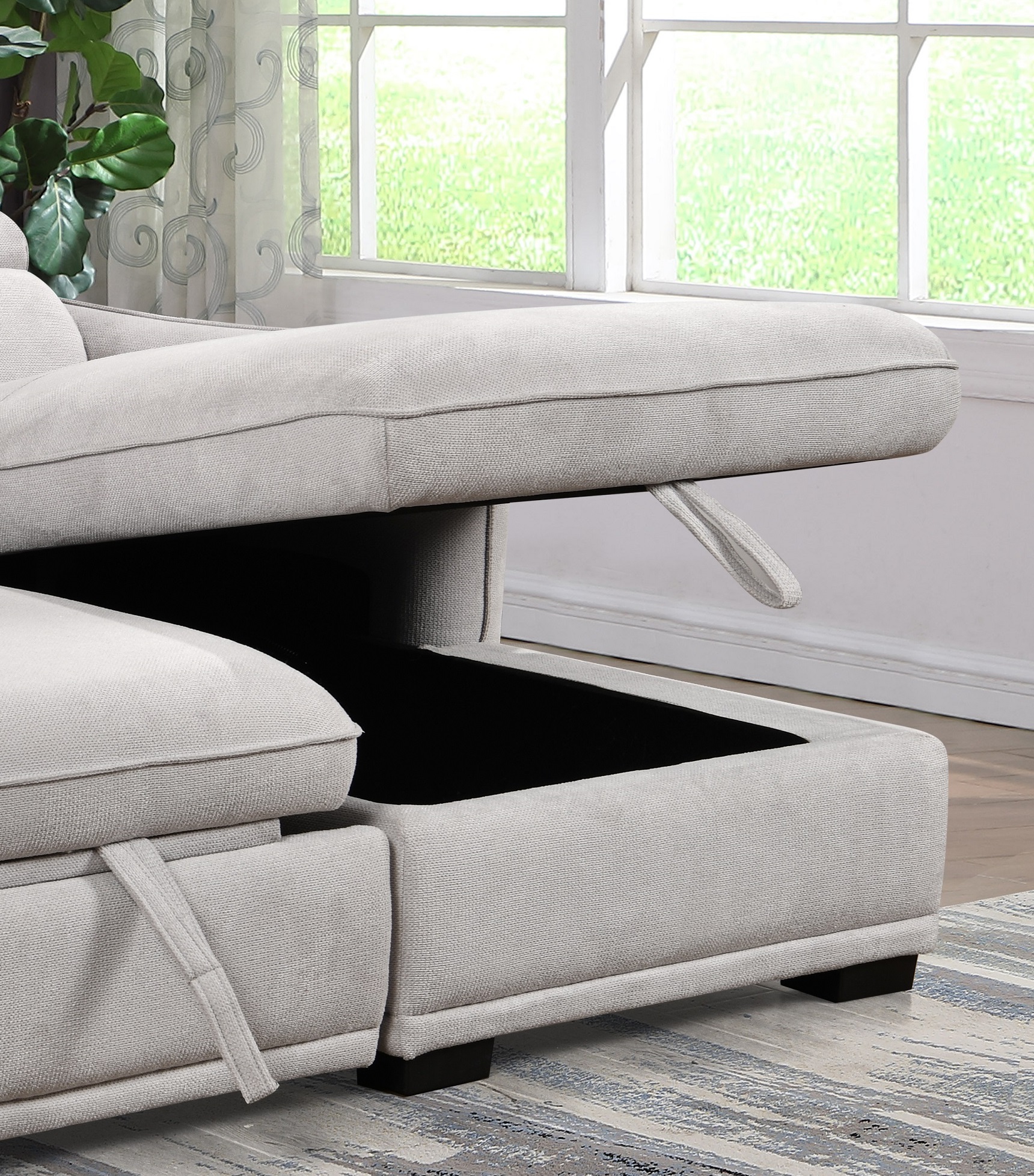 - Right Hand Facing Chaise - Opens to a Bed - Adjustable Headrests - Tufted Back and Seat - Large Lift Up Storage Compartment - Soft Light Grey Fabric