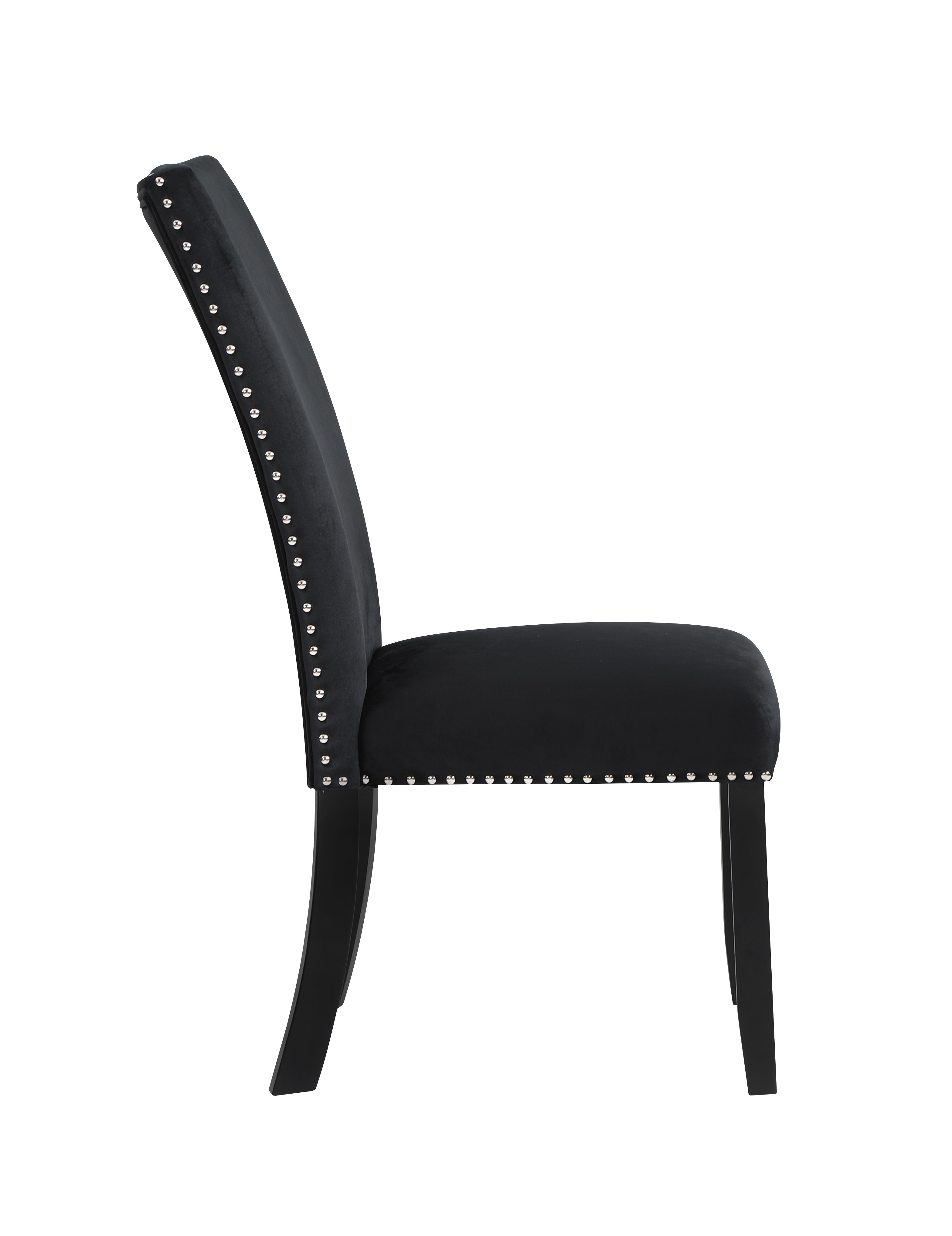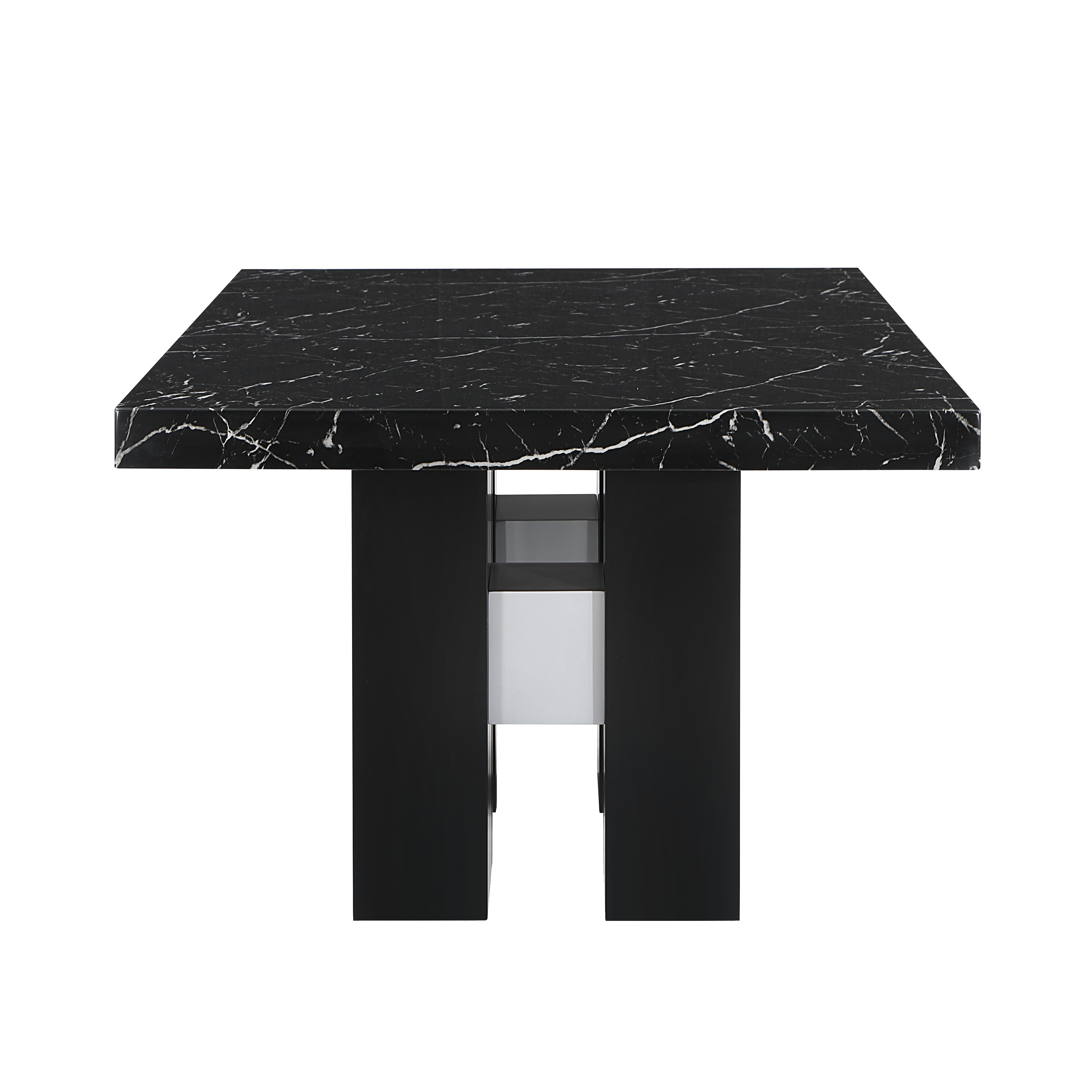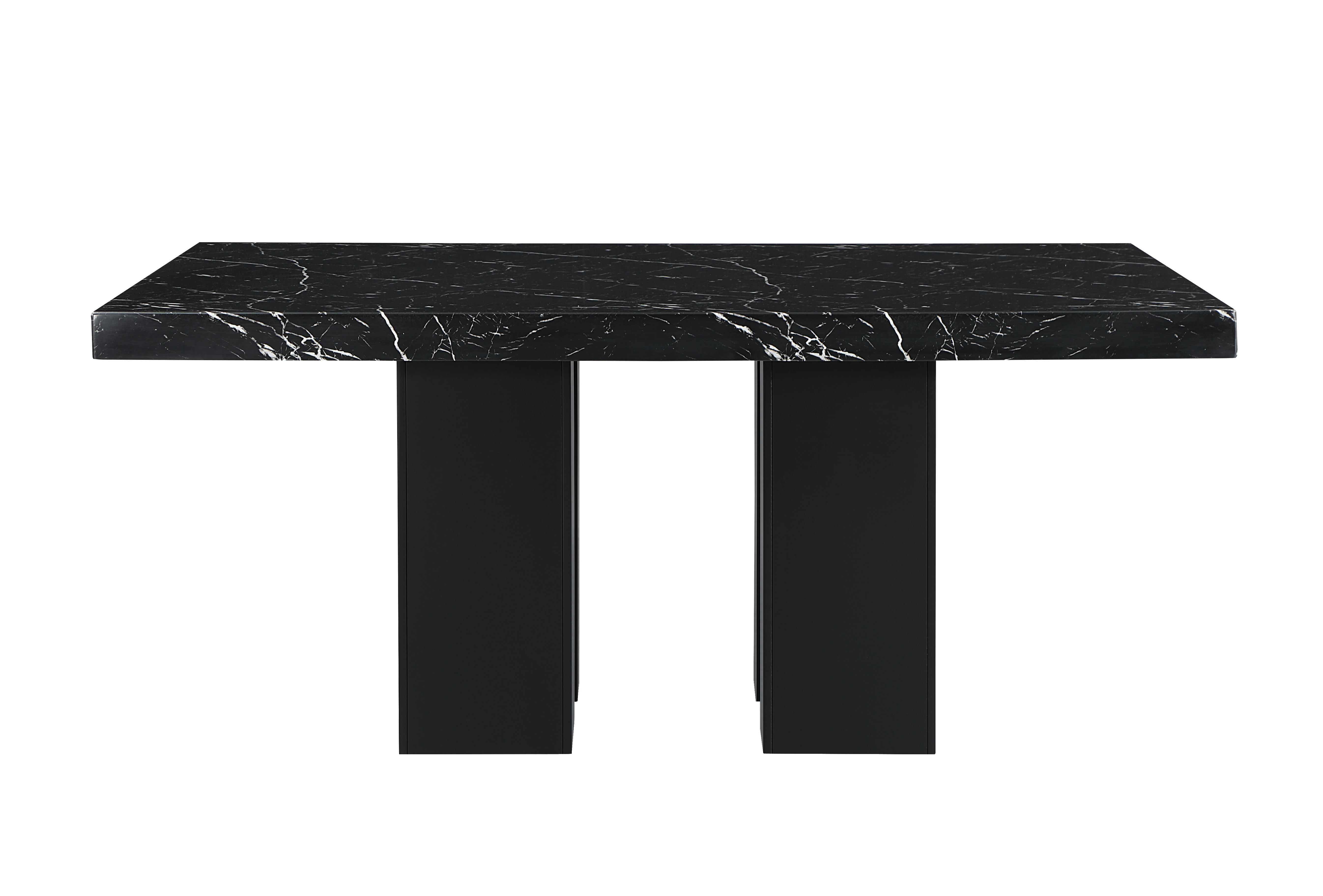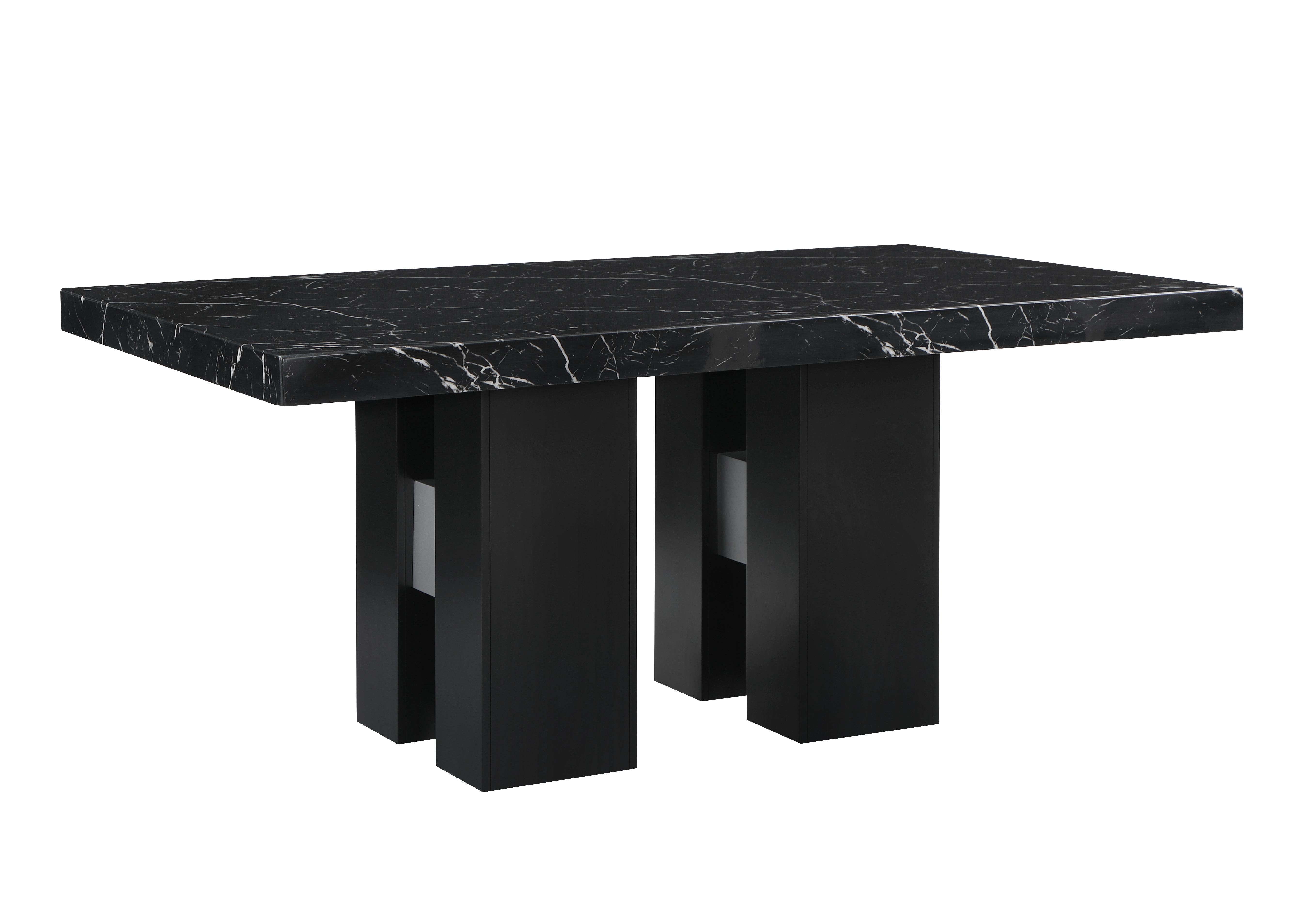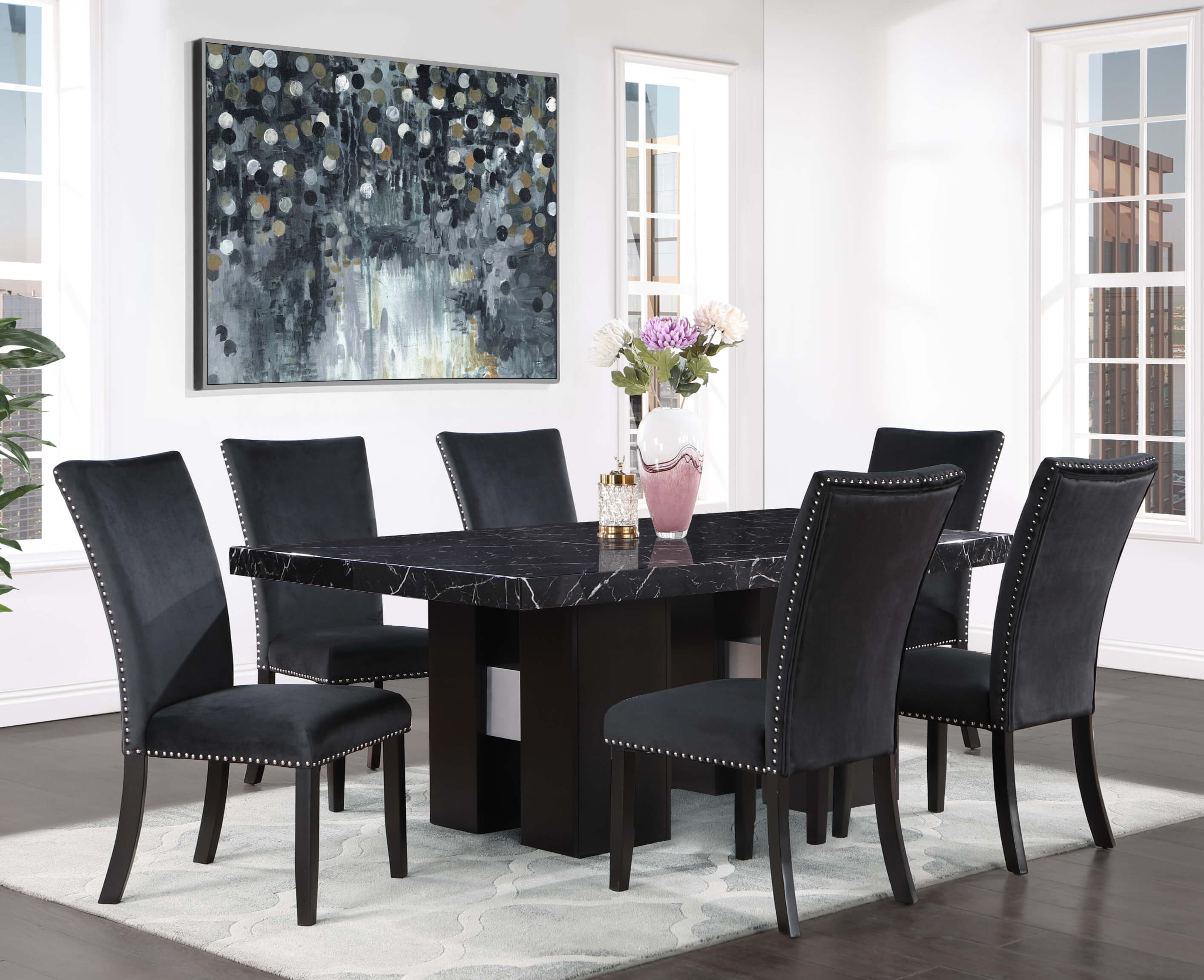 Table: Faux Black Marble Top with Double Pedestal Base Chairs: Soft Overstuffed Black Velvet Chairs with Nailhead Trim