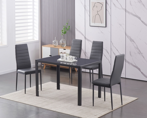 Table: Tempered Grey Glass with Grey Metal Frame Chairs: Grey Cushion Seat With Horizontal Stitching Details and Grey Tapered Legs