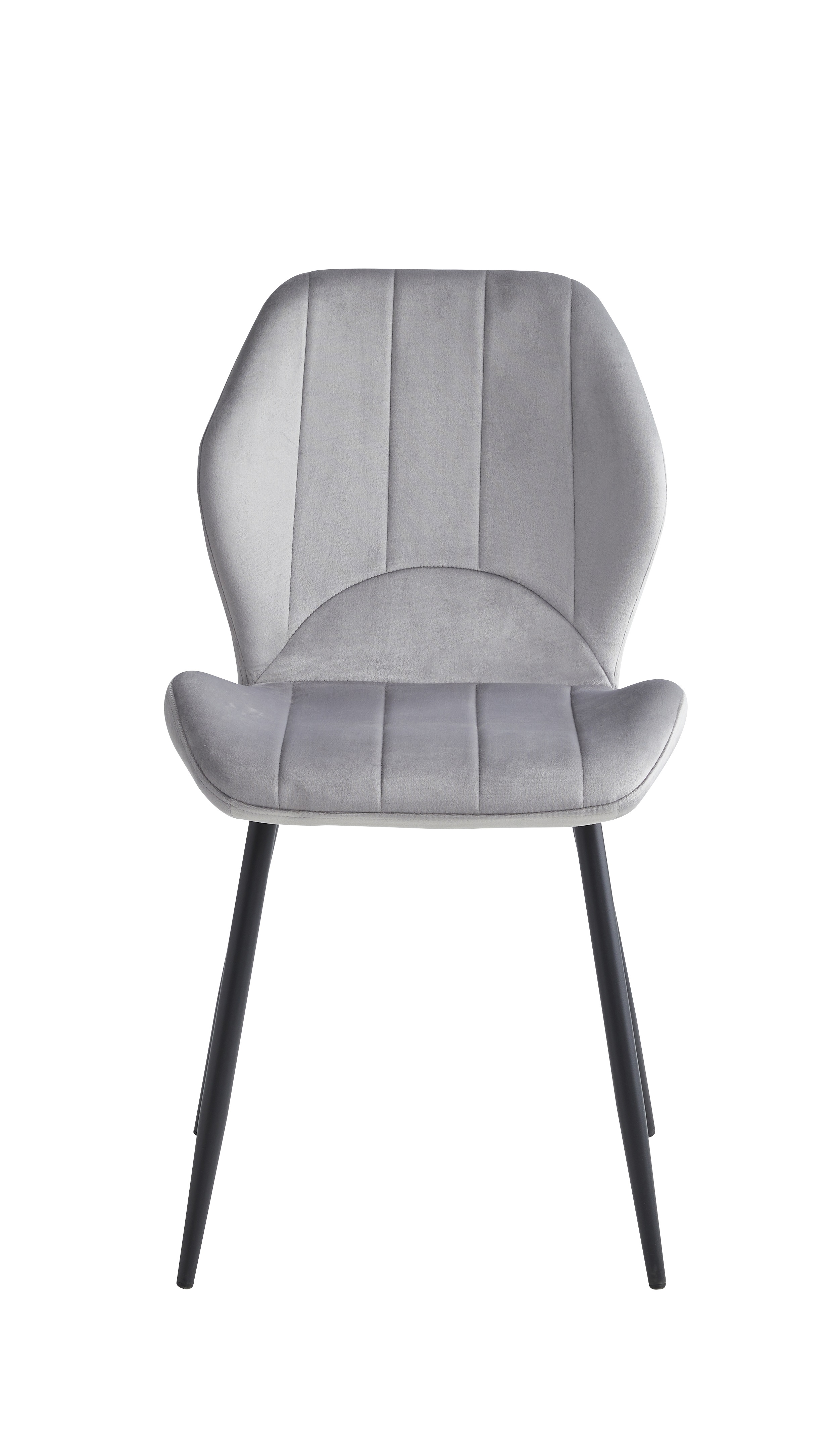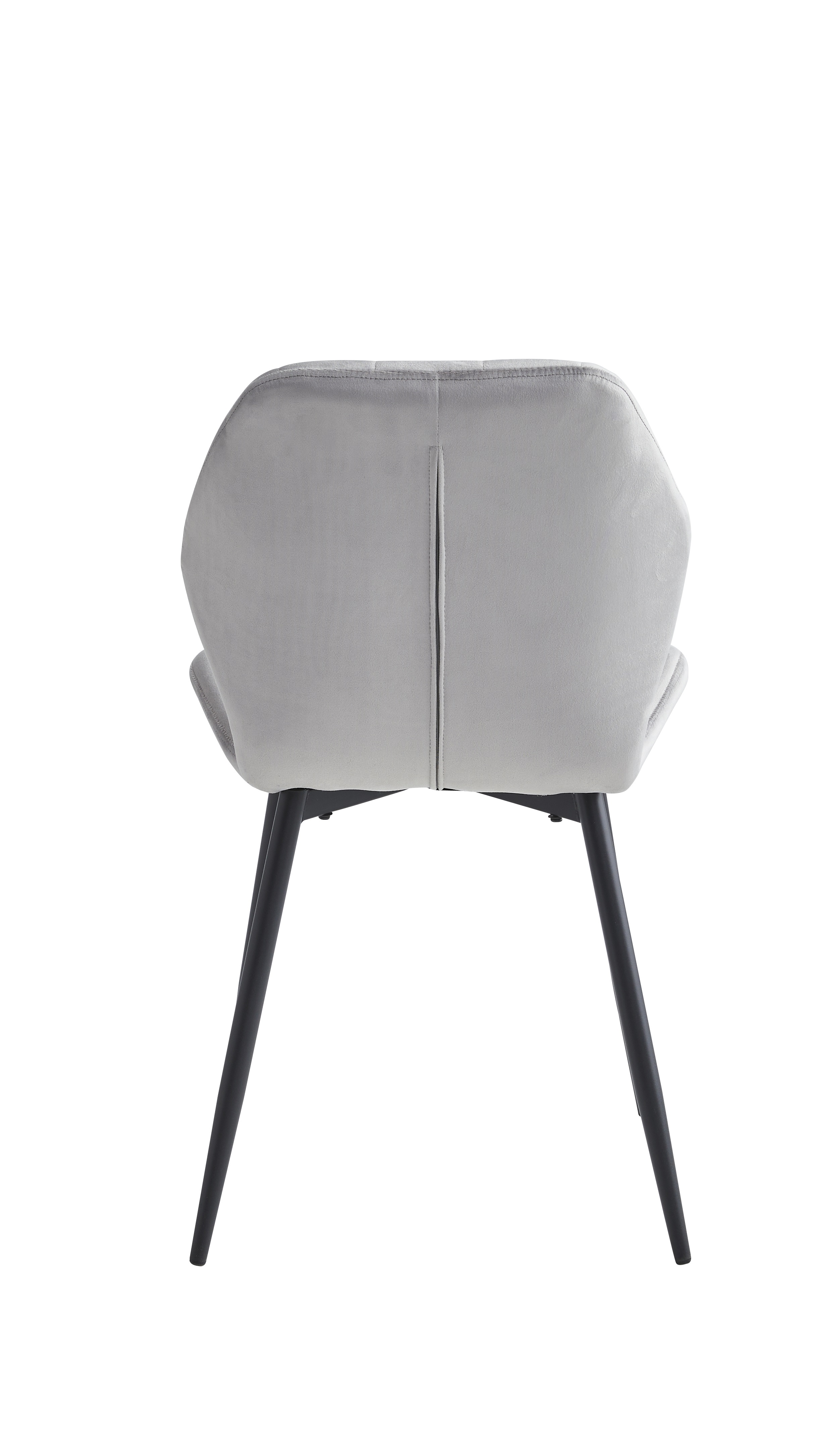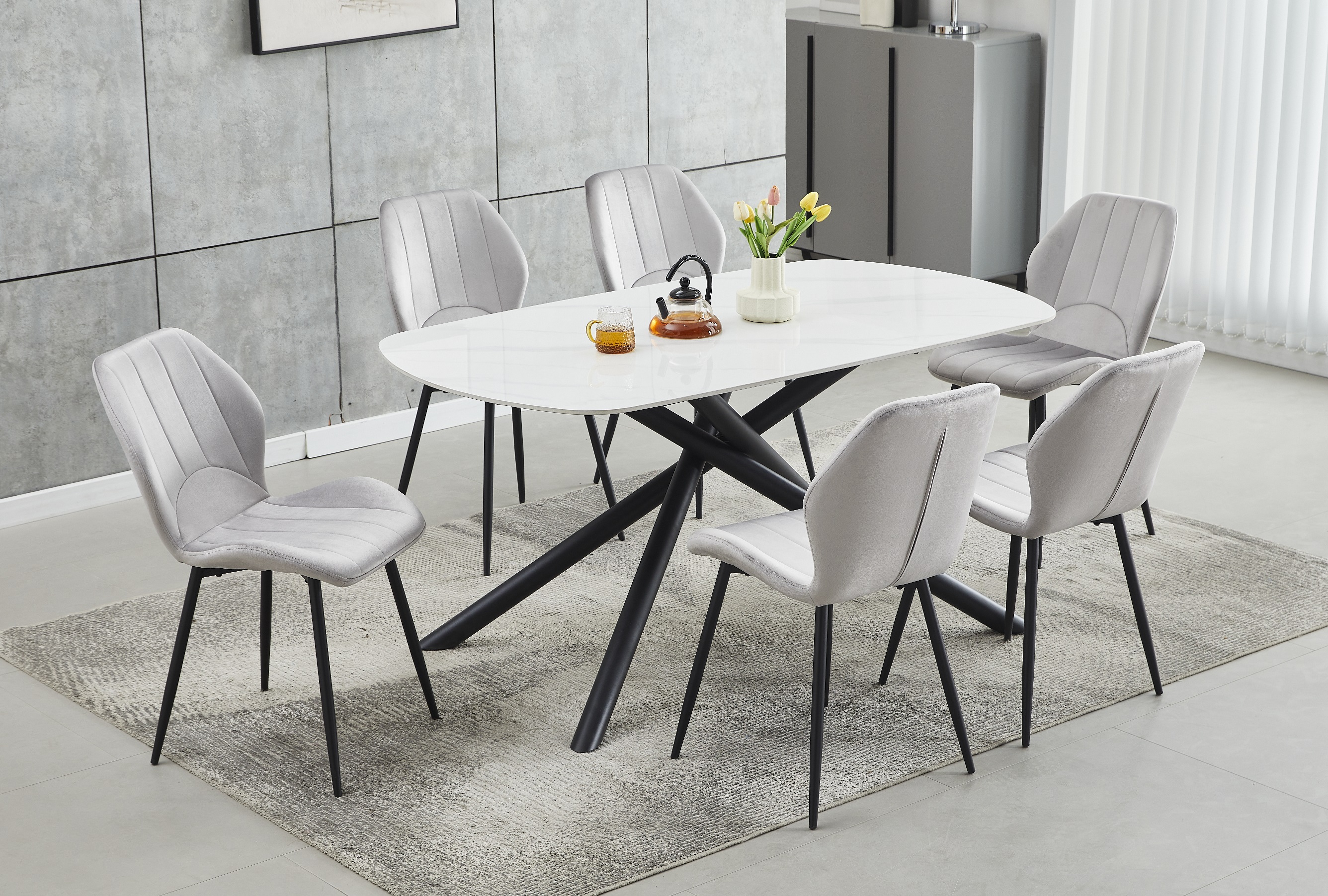 Table: Sintered Stone White Marble Top With Black Steel Legs. Chairs: Light Grey Velvet with Stitching Details, Black Steel Legs.