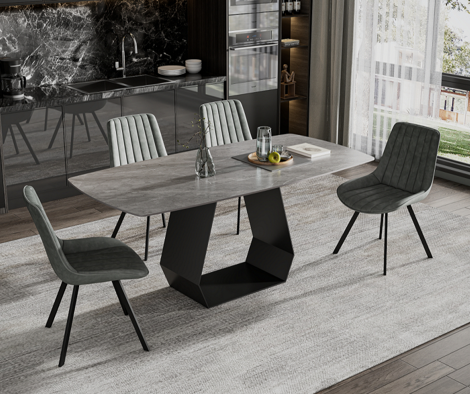 Table: Sintered Stone Armani Grey Marble Top With Carbon Black Steel Base. Chairs: Soft Grey PU, Black Steel Legs.
