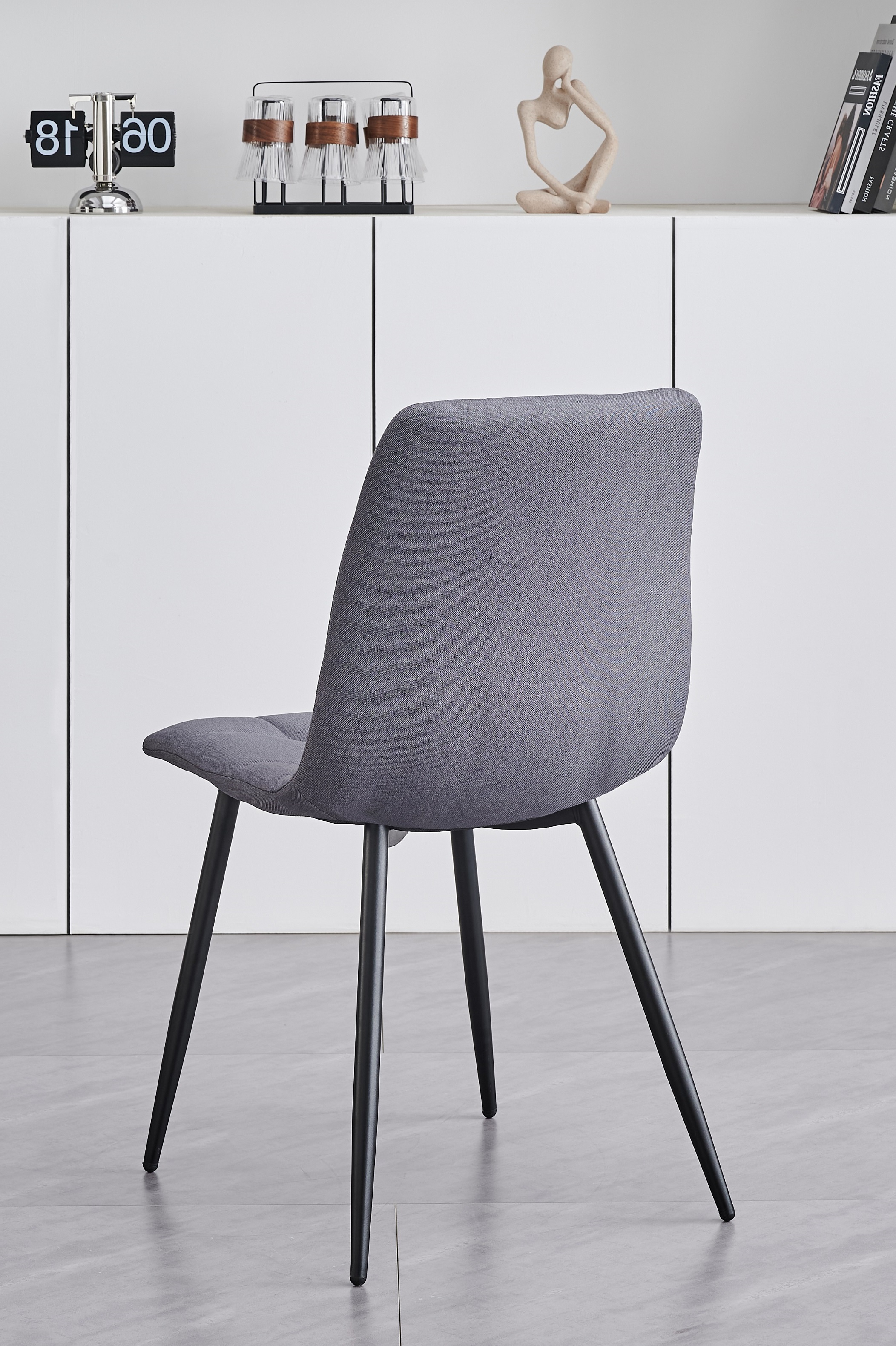 Table: White Marble Veneer Top With Black Pedestal Steel Base Chairs: Grey Fabric with Cross Stitching Details, Black Steel Legs