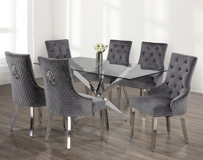 T-1448 Table - 10mm Tempered Clear Glass - Sturdy Chrome Legs - 63”L 36”W 30”H C-1250 Chairs - Chrome Lion Knocker - Polished Chrome Frame - Diamond Pattern Quilted Back - Button Tufted Front - Nailhead Details - 25'L 23'W 38'H - Grey Velvet