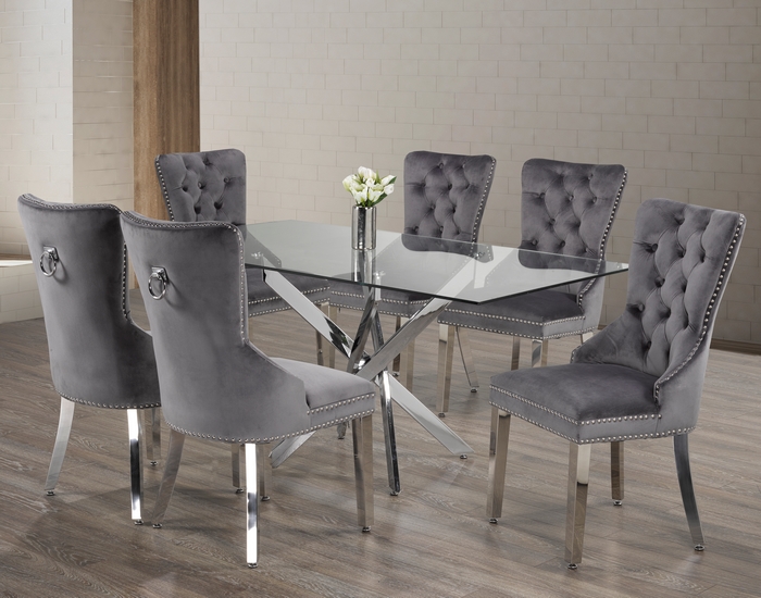 Table: 10mm Tempered Clear Glass, Chrome Legs; Chairs: Polished Chrome Frame, Grey Velvet