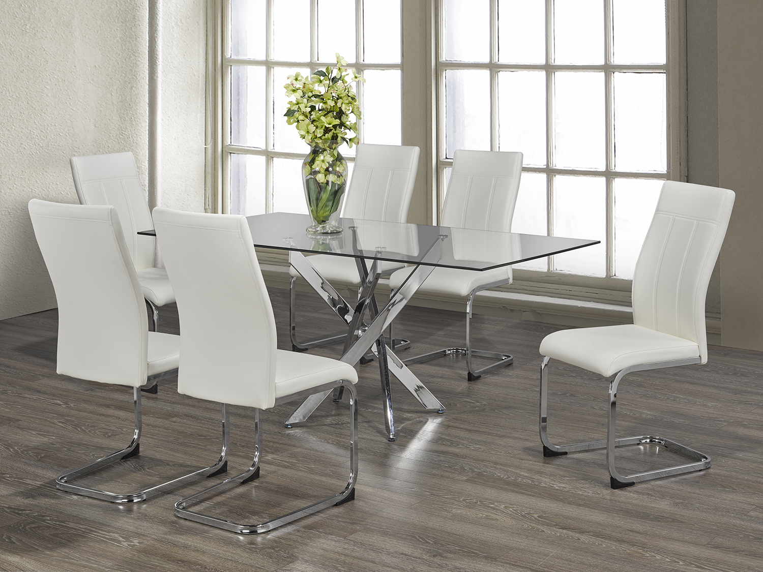Table: 10mm Tempered Clear Glass with Chrome Legs Chairs: White PU Cushion Seats with Chrome Legs