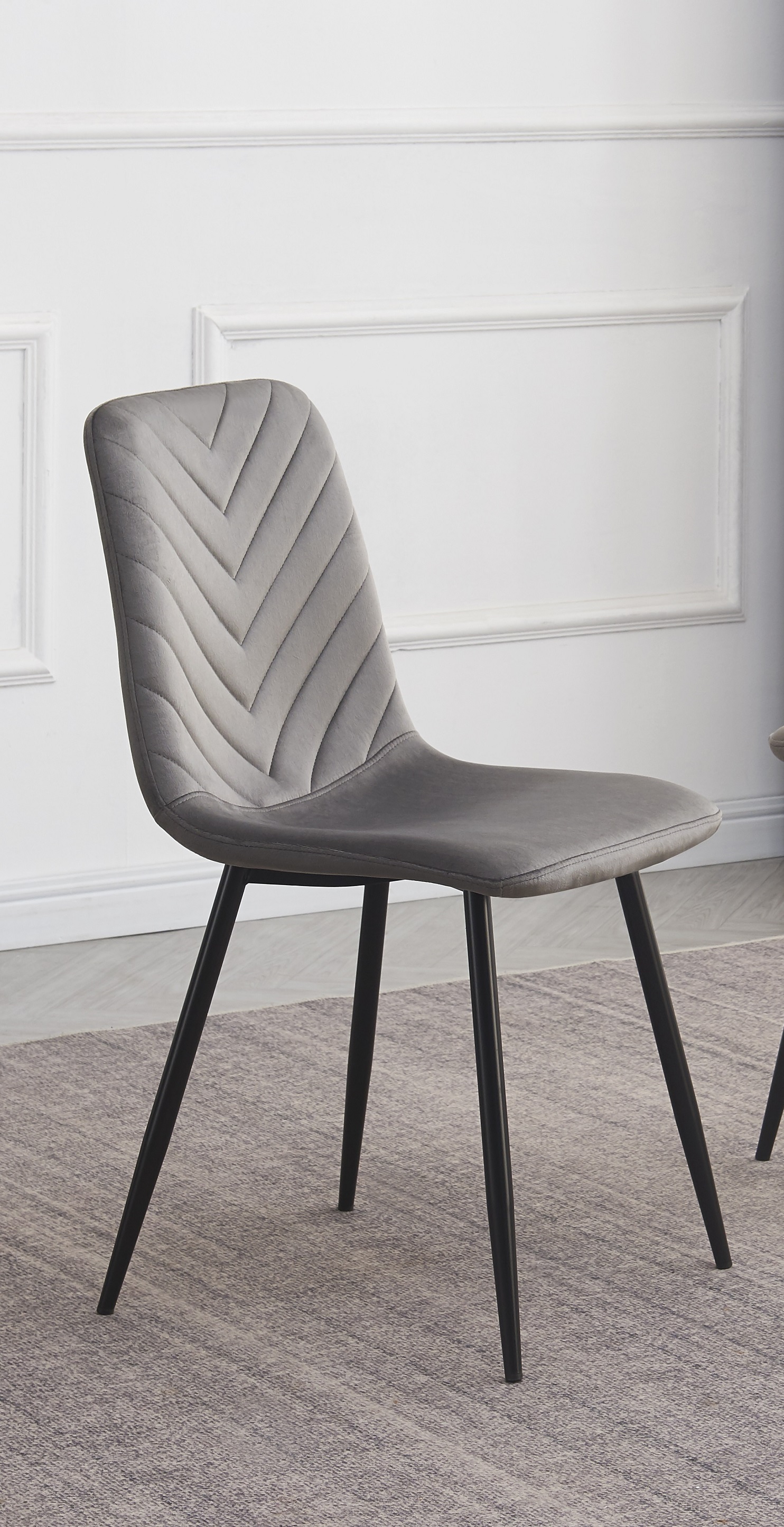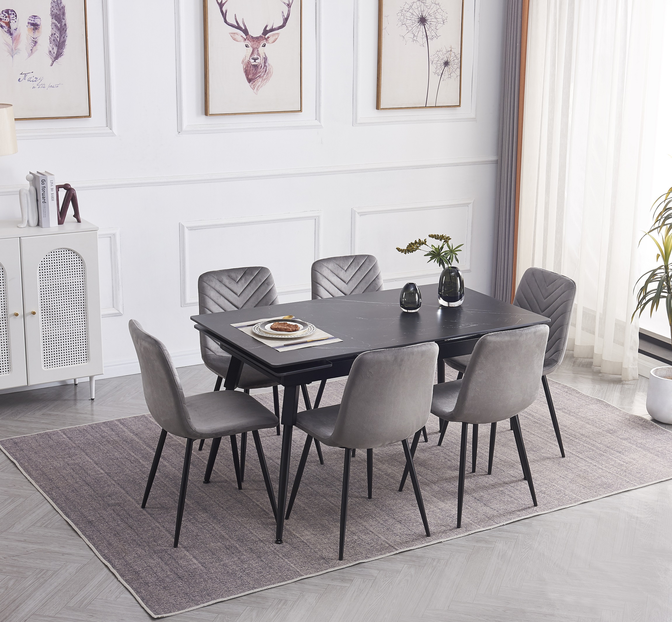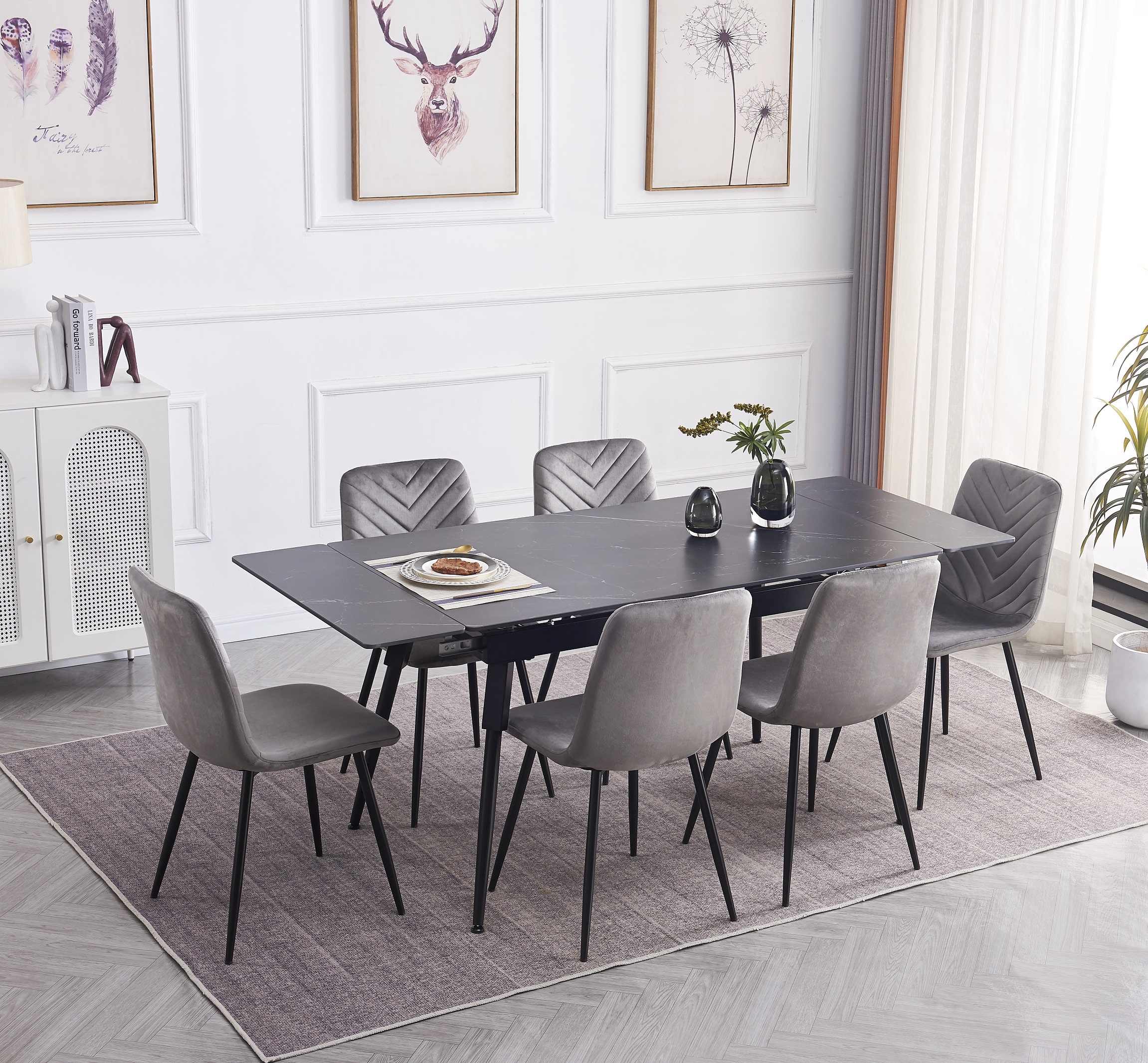 Extension Table: Sintered Stone Black Marble Top With Black Steel Legs. Chairs: Soft Grey Velvet, Stitching Details & Black Steel Legs